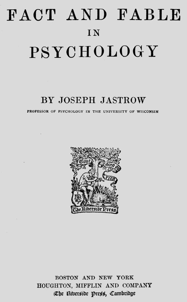 Project Gutenberg's Fact and Fable in Psychology, by Joseph Jastrow This eBook is for the use of anyone anywhere in the United States and most other parts of the world at no cost and with almost no restrictions whatsoever. You may copy it, give it away or re-use it under the terms of the Project Gutenberg License included with this eBook or online at www.gutenberg.org. If you are not located in the United States, you'll have to check the laws of the country where you are located before using this ebook. Title: Fact and Fable in Psychology Author: Joseph Jastrow Release Date: May 4, 2015 [EBook #48869] Language: English Character set encoding: UTF-8 *** START OF THIS PROJECT GUTENBERG EBOOK FACT AND FABLE IN PSYCHOLOGY *** Produced by Bryan Ness, JoAnn Greenwood and the Online Distributed Proofreading Team at http://www.pgdp.net (This file was produced from images generously made available by The Internet Archive/Canadian Libraries)
