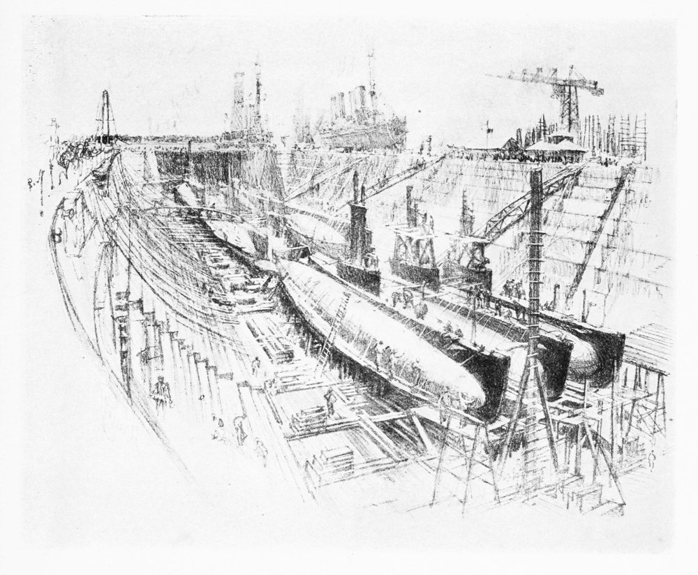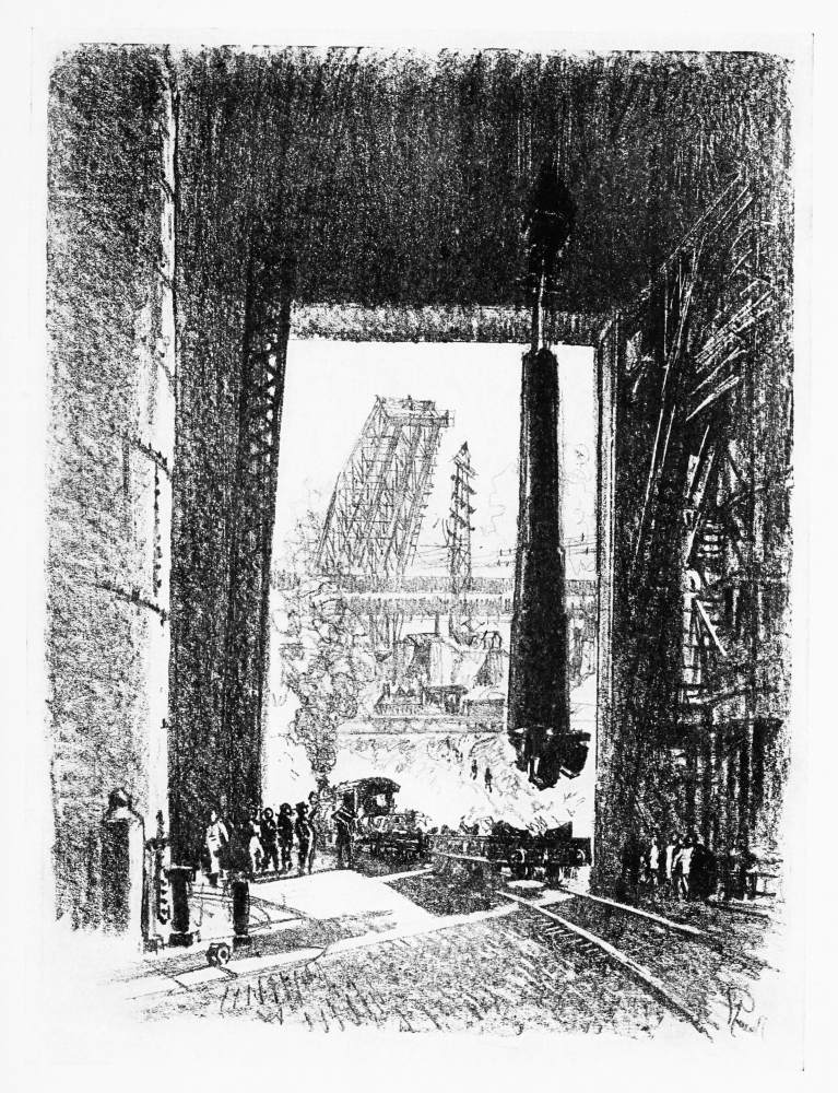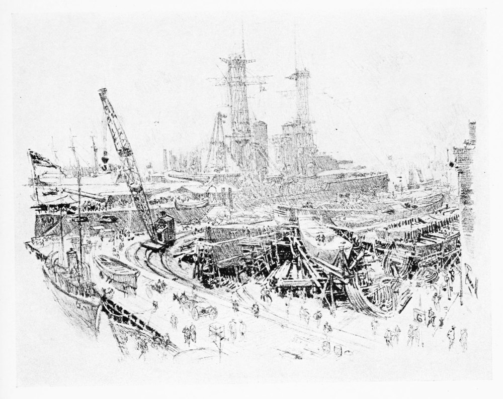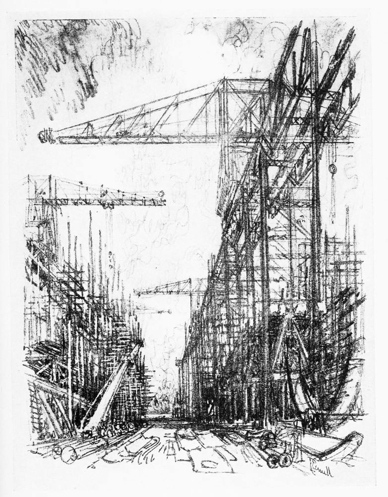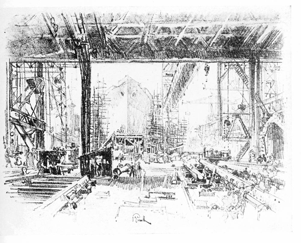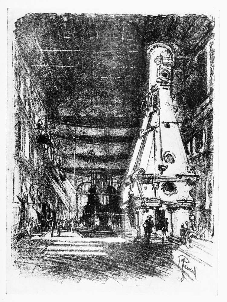 I HAVE come back from the Jaws of Death—back from the Mouth of Hell—to my own land, my own people. I have never passed such an exciting year in my life—and beside, I hope I have been able to accomplish something in my work which shall show one phase of the Wonder of the World’s Work of to-day. I was honoured a year ago by being permitted by the Rt. Hon. David Lloyd George, then Minister of Munitions in England, to make drawings in the various factories and works and shipyards which were engaged in war work in that country—and the records of what I saw were published as lithographs of War Work in England and in a previous volume in this series. Now, though I do not believe in war, I do not see why some pictorial record of what is being done to carry on the war should not be made—made from an artist’s standpoint—for we are in it—being in the world—but I am not of it.