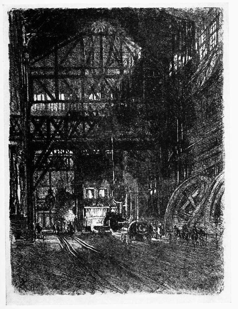 YES, locomotives can soar—can fly—and, like Mahomet’s coffin, stand in the air; and they do these things in a blaze of glory—because the shop where they are built is not big enough to shift them about in any other way. As the engine sailed toward me I tried to make a note of it. “Why would you like to draw it?” said the manager, as I frantically went on making notes of the approaching monster. “Which end would you like up?” He made a signal, they don’t talk in these shops, it stopped and there it hung. “Bring on another,” signalled the manager—and so I drew and so the creature posed till I had finished—an excellent model in a wonderful studio.