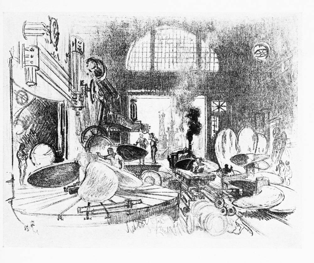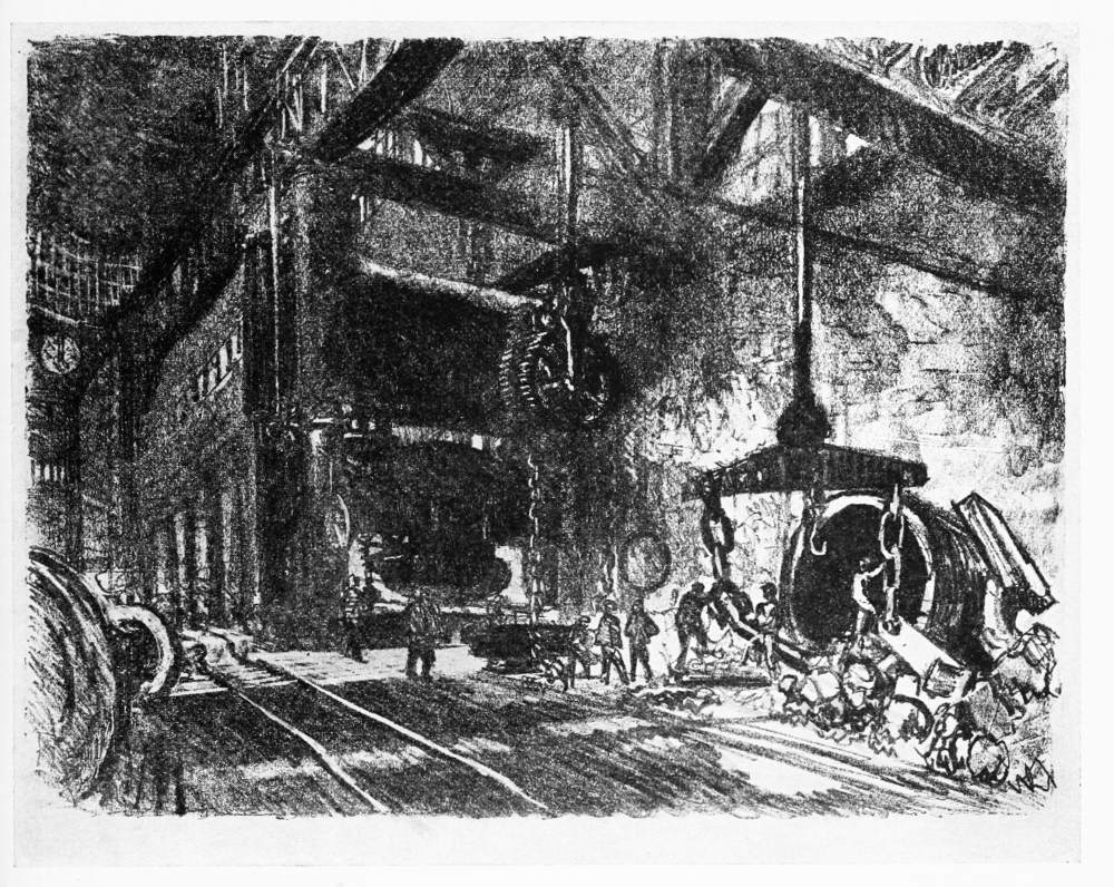 When my work—or as much of it as I was allowed to do—was finished and exhibited and published—I was invited by the French Minister of Munitions, M. Albert Thomas, to visit the front and make studies of similar subjects in France, but—owing to a combination of unfortunate circumstances—though I went to France twice during the Summer of this year, I was unable to get anything of importance. This was my fault, or my misfortune—I failed—and the memory of my failure will haunt me, and be a cause of regret to me, all my life—unless I am able to wipe out my failure—in another visit to France. But though I failed to make any drawings—any records of the subjects I was so freely shown—I was shown on my two visits many subjects, which were supremely interesting, could I have but drawn them—had I been able to do so they would have been worth doing. Not only was I taken to the front, which was not the part I saw, picturesque, but I was also taken to see some of those parts of France which have been fought over, some of the towns which have been destroyed, some of the land which is desolate, and I have also seen some of the French munition factories. Then I came home, for I believe the place for an American at the present time is at home. And on my arrival I was authorized to make records by our Government similar to those I had made in England, and had failed to make in France—what I have done in the United States is shown in this book.