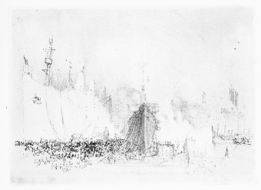 But in the shed in rows, in piles, in layers, lay every part of the ship ready to fit together—all in order. As I drew, boats and boilers came out of the shop and went to their places on board.