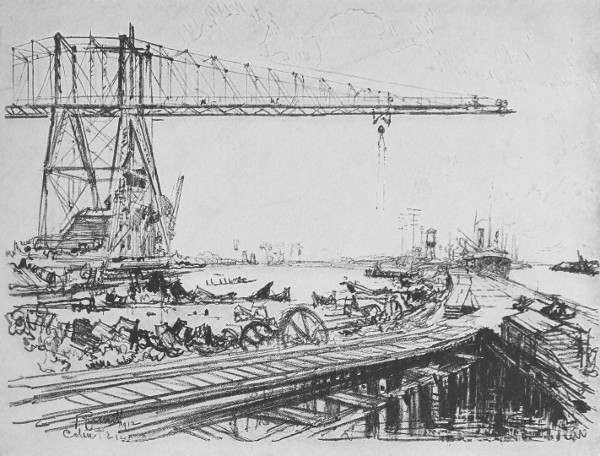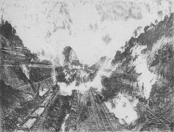 I did not bother myself about these things, nor about lengths and breadths and heights and depths. I went to see and draw the Canal, and during all the time I was there I was afforded every facility for seeing the construction of the Panama Canal, and from my point of view it is the most wonderful thing in the world; and I have tried to express this in my drawings at the moment before it was opened, for when it is opened, and the water turned in, half the amazing masses of masonry will be beneath the waters on one side and filled in with earth on the other, and the picturesqueness will have vanished. The Culebra Cut will be finer, and from great steamers passing through the gorge, worth going 15,000 miles, as I have done, to see. But I saw it at the right time, and have tried to show what I saw. And it is American—the work of my countrymen.