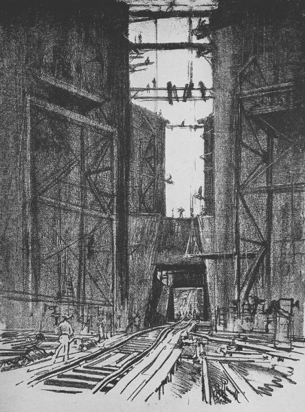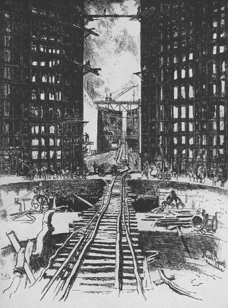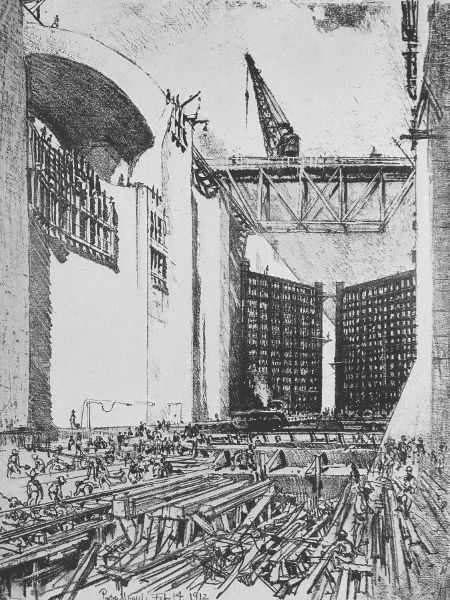 THERE is a safety gate in each lock, to protect, in case of accident, the main lock gate, just suggested, with the figures working at the armor-plate facing, on the extreme right. Beyond are the outer walls and approaches of the upper lock, and beyond these, but unseen, the lake. At the bottom is the railroad and the temporary opening shown in the previous drawing. The scale, the immensity of the whole may be judged by the size of the engines and figures. I have never seen such a magnificent arrangement of line, light and mass, and yet those were the last things the engineers thought of. But great work is great art, and always was and will be. This is the Wonder of Work.