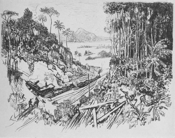 WHILE I was on the Isthmus the old line from Gatun to the Culebra Cut at Bas Obispo was abandoned, owing to the rising waters of the lake, which will soon cover towns, and swamps, and hills, and forests. This drawing was made looking across the lake near Gatun, with the dam in the distance, and I have tried to show the rich riot of the jungle. Below, on the old road, is a steam shovel digging dirt. The little islands, charming in line, are little hills still showing above the waters of the forming lake.