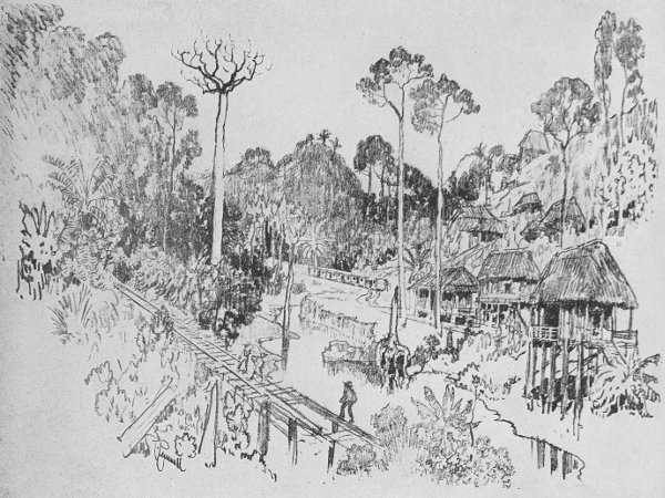 THIS lithograph was made on the new line, which discovered to the visitor primitive Panama, its swamps, jungles and native villages; but, owing to Colonel Gorgas, native no longer, as they are odorless and clean; but the natives, with their transformation, seem to prefer to the palm-leaf roof, corrugated iron and tin, and abandoned freight cars to live in. The huts are mostly built on piles near the rivers. In the background can be seen the strange-shaped mountains and strange-shaped trees. The white tree—I don't know its name—with the bushy top has no bark, and is not dead, but puts out leaves, Mrs. Colonel Gaillard tells me, in summer; and she also tells me the jungle is full of the most wonderful orchids, birds, snakes, monkeys and natives, and offered to take me to see them. I saw her splendid collection of orchids at Culebra, through the luxuriance of which Colonel Gaillard says he has to hew his way with a machete every morning to breakfast, so fast do plants grow on the Isthmus. Advantage of this rapidity of jungle growth has been taken to bind together the completed parts of the surface of the dam, which are covered with so much vegetation that I could not tell Nature's work from that of the engineers.