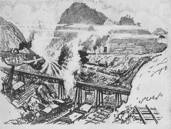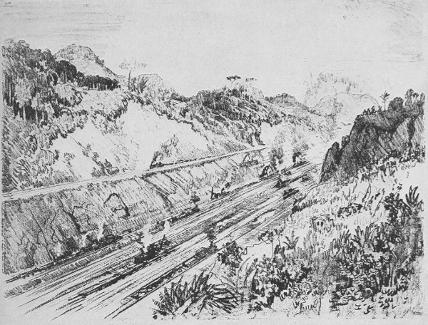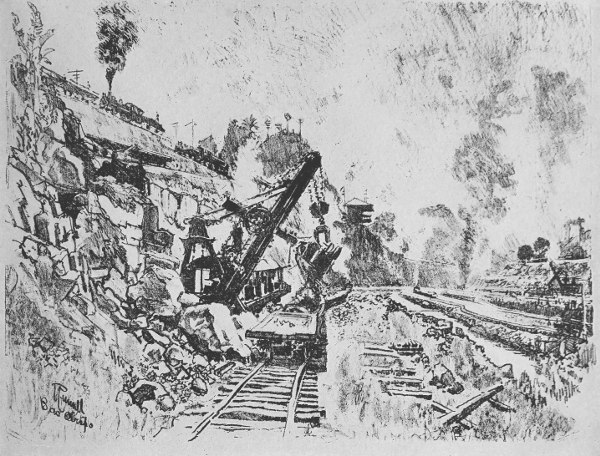 THE Culebra Cut commences near Bas Obispo—from this place—where the Chagres River enters Gatun Lake, the cut extends for nine miles, to Pedro Miguel. All between here and Gatun will be under water. The drawing was made at the bottom of the cut, and the various levels on which the excavations are made may be seen. The dirt trains, one above the other, are loading up from the steam shovels on each side of the old river bed in the centre. The machinery for shifting tracks and unloading trains is wonderful, but not very picturesque.