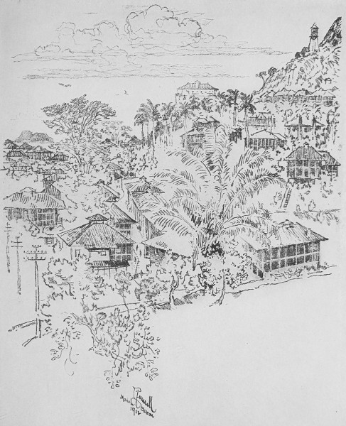 In the evening a ride of two hours took me over the thirty miles to Panama—one of the last passengers over the old line of the Panama Railway, now buried under the waters of the growing lake. From the railroad I saw for the first time the primeval forest, the tropical jungle, which I had never believed in, never believed that it could not be penetrated save with an axe or a machete; but it is so, and the richness of it, the riot of it, the variety of it, is incredible and endless. The train puffed along, in that time-taking fashion of the tropics I should soon be familiar with, passing points of view I made notes of, for first impressions are for me always the best, and one trip like this gives me more ideas than days of personal pointing out. Finally Panama was reached in the dark; all I saw was a great hill lit up with rows of lights, one above the other, in the night.