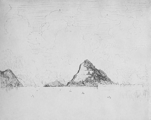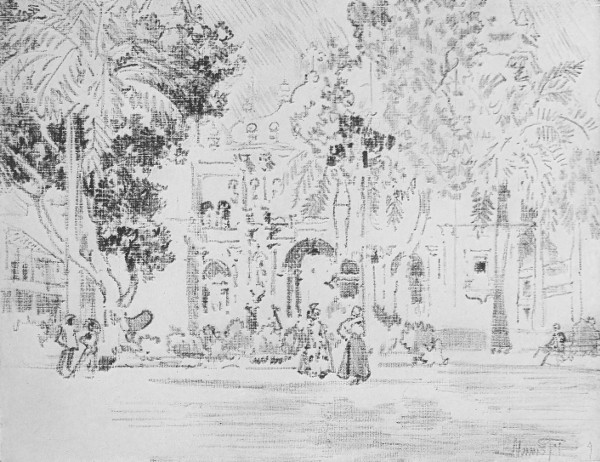 Across the bridge was a telephone station and beyond and below it the great approaches to the locks along which electric locomotives will draw the ships that pass through. There was a subject, and I tackled it at once. In the distance the already filling lake—among islands, but the highland still above the water, dotting it, crowned with palms and strange trees; dredgers slowly moved, native [Pg 9] canoes paddled rapidly, over all hovered great birds. To the right was the long line of the French Canal, almost submerged, stretching to the distance, against which, blue and misty and flat, were strange-shaped mountains, outlined with strange-shaped trees. Bridges like those of Hiroshigi connected island with island or with the mainland. It was perfect, the apotheosis of the Wonder of Work, and as I looked the whole rocked as with an earthquake—and then another. I was dragged into the hut as showers of stones rattled on the roof as blast after blast went off near by. Soon people in authority came up—I supposed to stop me; instead it was only to show pleasure that I found their work worth drawing. These men were all Americans, all so proud of their part in the Canal, and so strong and healthy—most of them trained and educated, I knew as soon as they opened their mouths—the greatest contrast to the crowd on the steamer, who now were all tamely following a guide and listening to what they could neither understand nor see during their only day ashore. These engineers and workmen are the sort of Americans worth knowing, and yet I did not see any golf links at Gatun. The day was spent in that telephone box and on the Spillway of the Dam—a semicircle of cyclopean concrete, backed by a bridge finer than Hokusai ever imagined, yet built to carry the huge engines that drag the long trains of dirt and rock across it, to make the dam. The dam, to me, was too big and too vague to draw. And all this is the work of my countrymen, and they are so proud of their work. Yet the men who have done this great work will tell you that we owe much to the French, and that if the engineers and the Commission at Panama had not the Government, with unlimited men and money, behind them, and the discoveries in sanitary science of which the French were ignorant, we, too, would have failed. They tell you, and show you how, the French worked on the Canal right across the Isthmus, and we are carrying out the great project they were unable to complete. And we have won the admiration of the world.