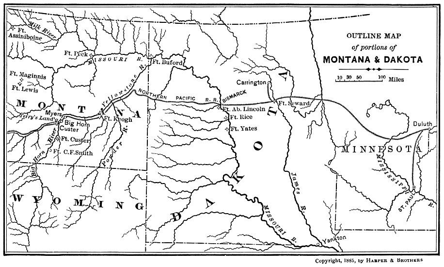 After that we went to Texas for a year, my husband still acting as major-general in command of Volunteers. In 1866 we returned to Michigan, and the autumn of the same year found us in Kansas, where the general assumed charge of the 7th (Regular) Cavalry, to which he had been assigned, with the rank of lieutenant-colonel in the Regular Army. We remained in Kansas five years, during which time I was the only officer’s wife11 who always followed the regiment. We were then ordered, with the regiment, to Kentucky. After being stationed in Elizabethtown for two years, we went to Dakota in the spring of 1873.