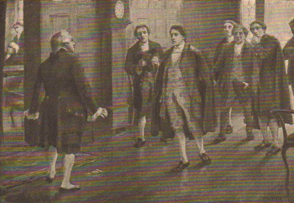 Just then a two-horse equipage was seen coming down the street, with the dust flying up from the great red wheels. In it sat a man, richly dressed, with his three-cornered hat set sideways over his powdered hair, his chin resting on his hands, which were supported by a gold-headed cane, and a sneer was upon the cruel lips.