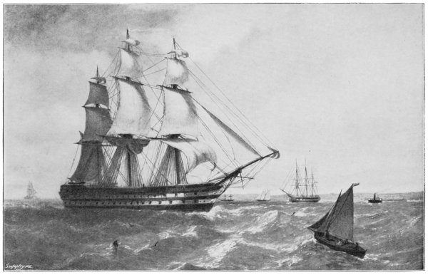 It was blowing a fresh gale when we took our wherry from the Hard at Portsmouth, and the double-fare flag was flying on the official tower; but go we must, though our boatman seemed to suggest that we should have a bad time of it outside; and so it turned out, for, besides being drenched to the skin on a cold December day, the butler and I, when we got alongside the noble10 ship, were sea-sick. My first obeisance to the Quarter-Deck—(I had been warned to be very particular about this)—must have lacked finish. My troubles were not over with that ceremony. I had hardly finished saluting the officer of the watch when a blue-jacket fell from out of the main-rigging on to a quarter-deck gun within a yard of me. He was killed instantly, and the sight was very painful.