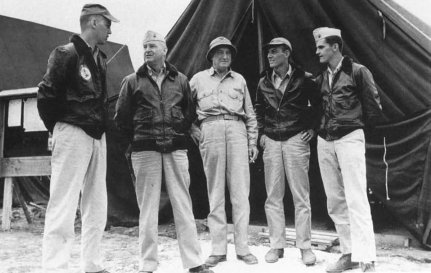 This is the last photograph taken of LtGen Simon B. Buckner, Jr., USA, right, before he was killed on 19 June, observing the 8th Marines in action on Okinawa for the first time since the regiment entered the lines in the drive to the south.