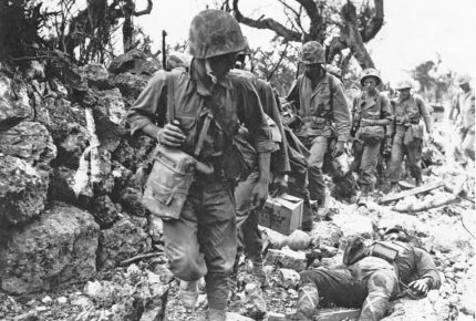 Assault troops of the 1st Battalion, 7th Marines, clamber over a seawall after landing on Blue Beach 2 on 1 April 1945, against no opposition at the beachhead.