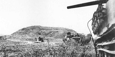 Lieutenant Colonel James C. Magee’s 2d Battalion, 1st Marines, used similar tactics in a bloody but successful day-long assault on Hill 69 west of Ozato on 10 June. Magee lost three tanks to Japanese artillery fire in the approach, but took the hill and held it throughout the inevitable counterattack that night.