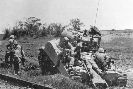 Working with LtCol “Jeb” Stuart of the 1st Tank Battalion, we developed a new method of protecting tanks and reducing vulnerability to the infantry in the assault. We’d place an artillery observer in one of the tanks with a radio to one of the 155mm howitzer battalions. We’d also use an aerial observer overhead. We used 75mm, both packs and LVT-As, which had airburst capabilities. If any Jap [suicider] showed anywhere we opened fire with the air bursts and kept a pattern of shell fragments pattering down around the tanks.