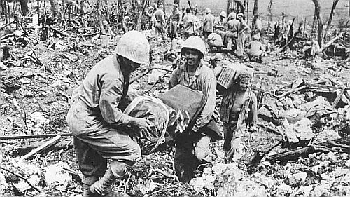 The battle for Kunishi Ridge continued. On 17 June the 5th Marines assigned K/3/5 to support 2/5 on Kunishi. Private First Class Sledge approached the embattled escarpment with dread: “Its crest looked so much like Bloody Nose that my knees nearly buckled. I felt as though48 I were on Peleliu and had it all to go through again.” The fighting along the crest and its reverse slope took place at point-blank range—too close even for Sledge’s 60mm mortars. His crew then served as stretcher bearers, extremely hazardous duty. Half his company became casualties in the next 22 hours.