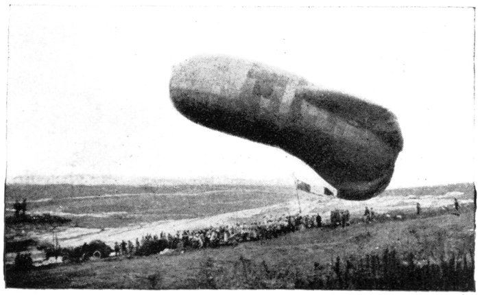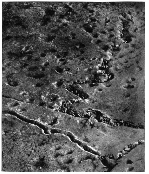 Before the battle.—Metaphorically speaking, the Flying Corps (aeroplanes and observation balloons) is the "eye" of the High Command, which largely depends on it for precise information regarding the enemy's movements and positions. It likewise regulates the artillery fire, and furnishes that arm with photographs, showing exactly the progress made by the destruction bombardments. Another equally important duty is to "blind the enemy" by destroying their aeroplanes and observation balloons.