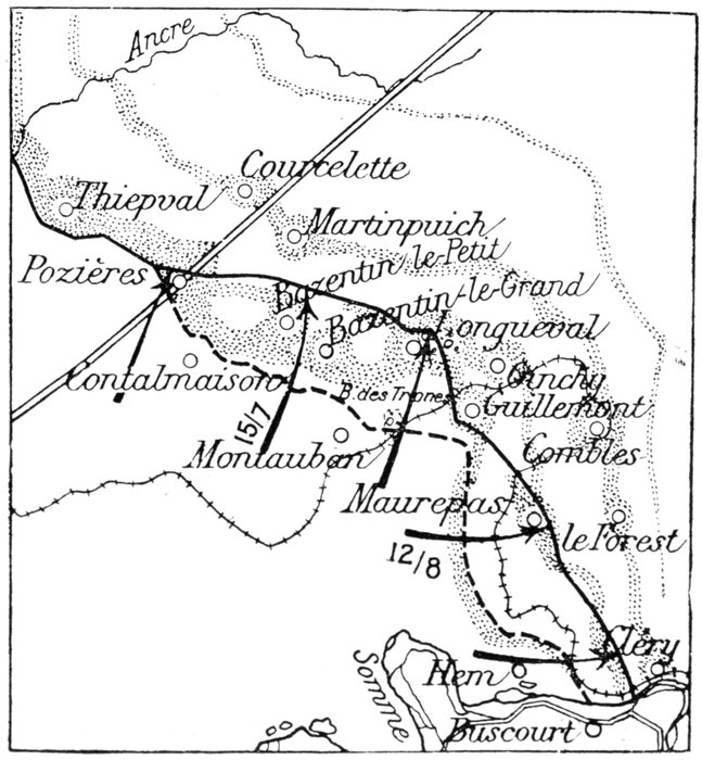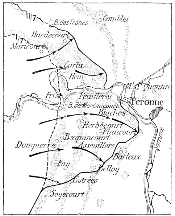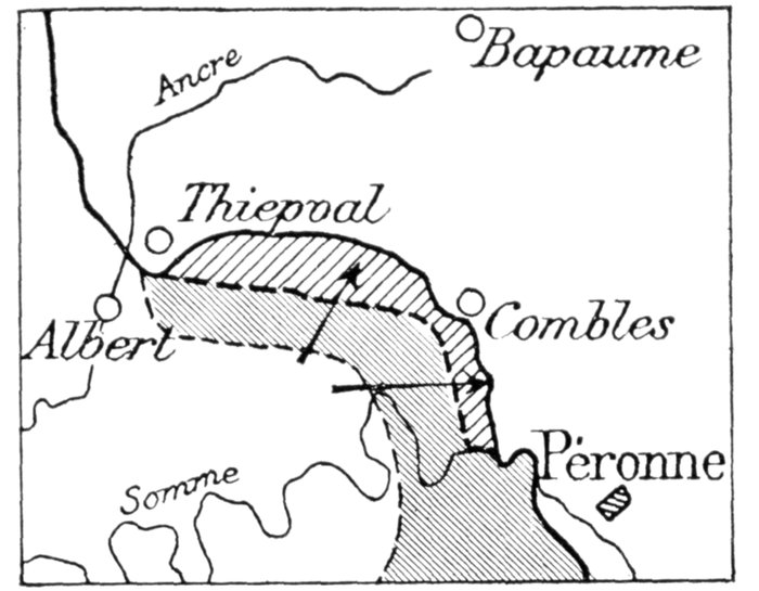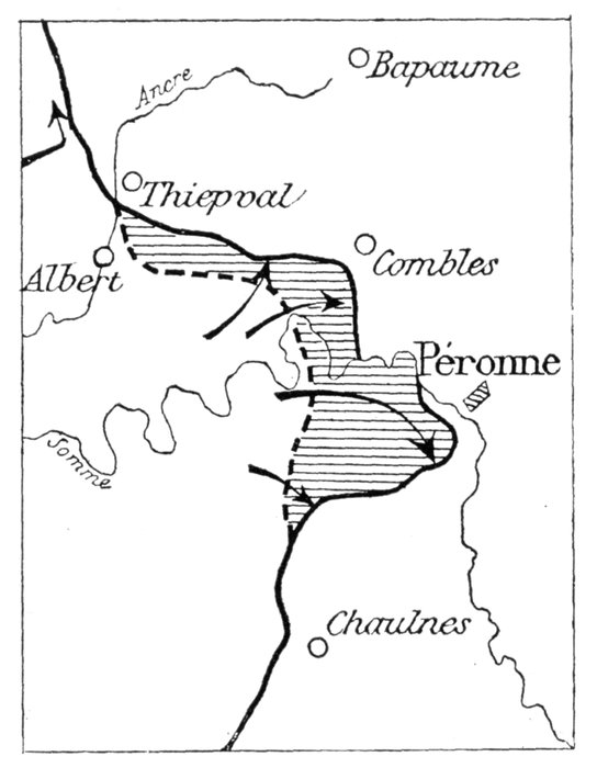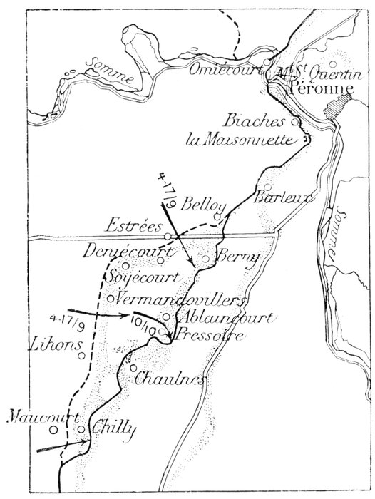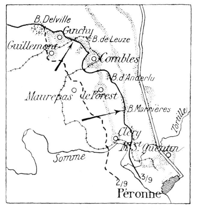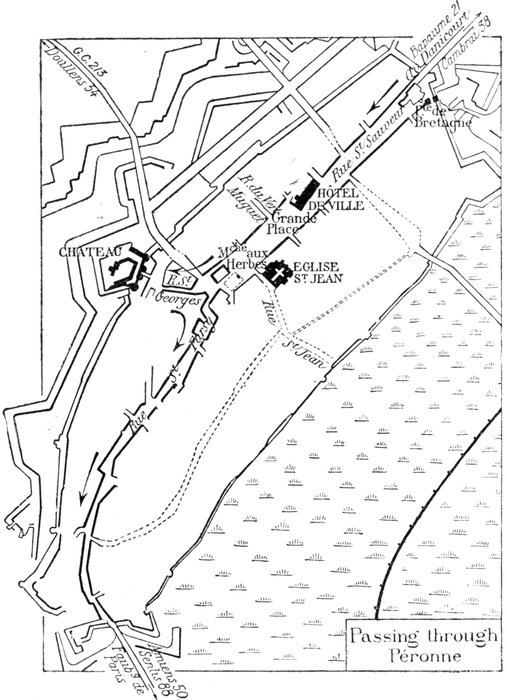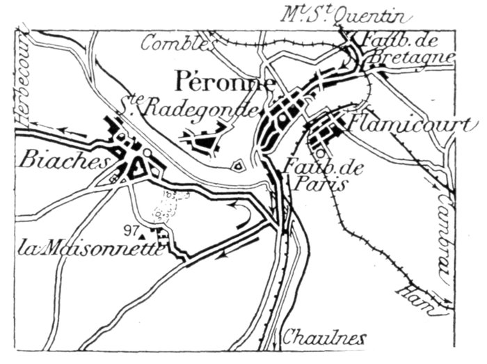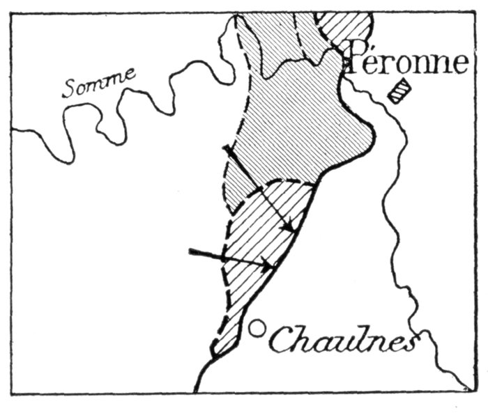 The Germans recaptured Chaulnes in March, 1918. On August 8 of the same year—their front having been pierced before Amiens—they were forced[Pg 131] to evacuate the Montdidier "pocket" and to retreat to the outskirts of Chaulnes. They reoccupied their positions of the trench warfare period, and the remains of their ancient defence-works were still strong enough to enable them to hold up the British pursuit. The town was only carried on August 28, after being surrounded.