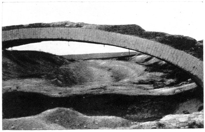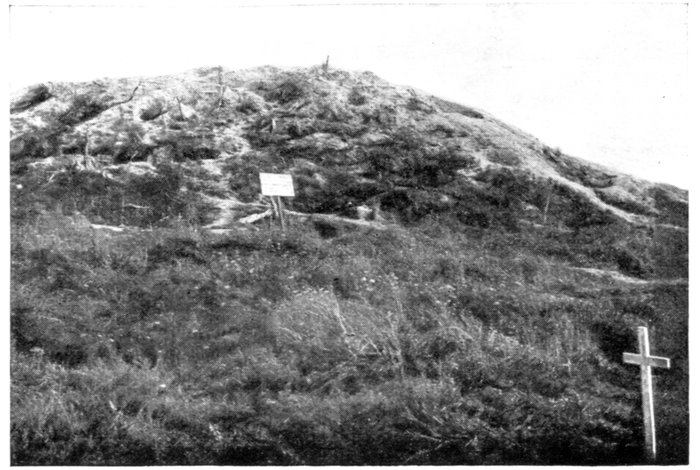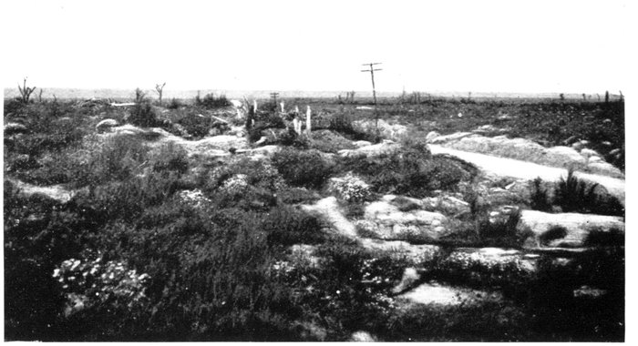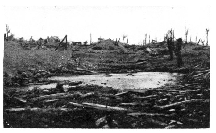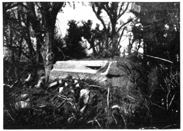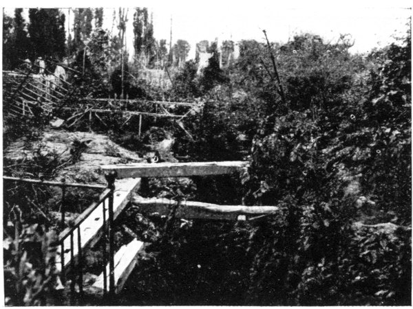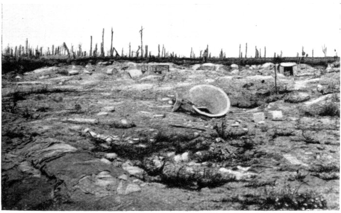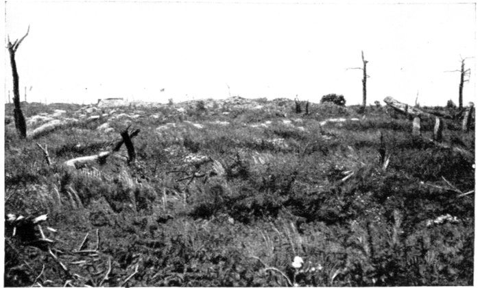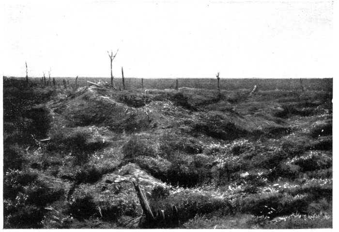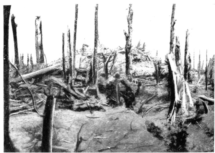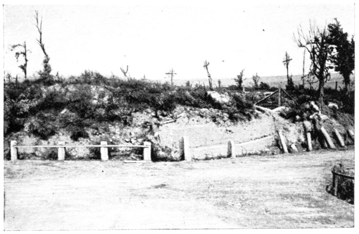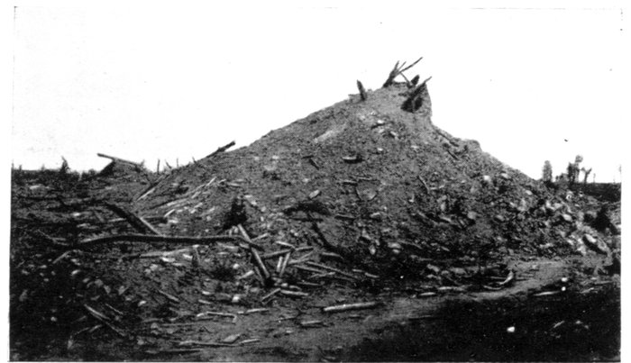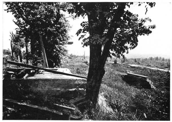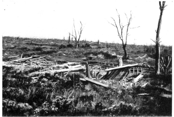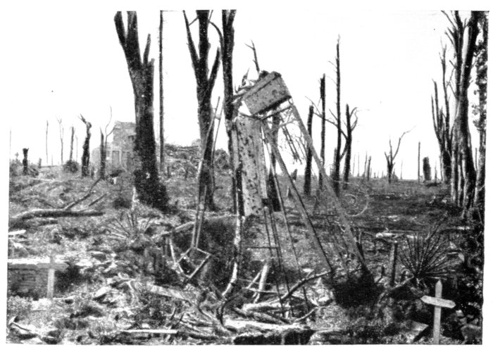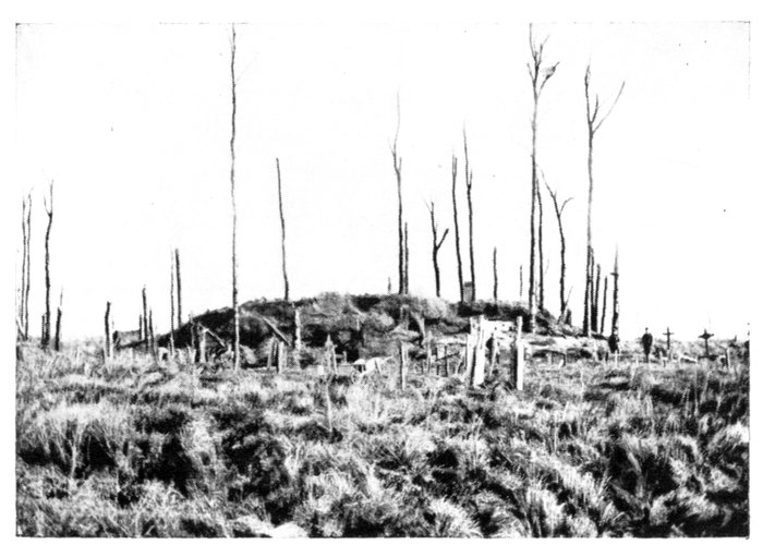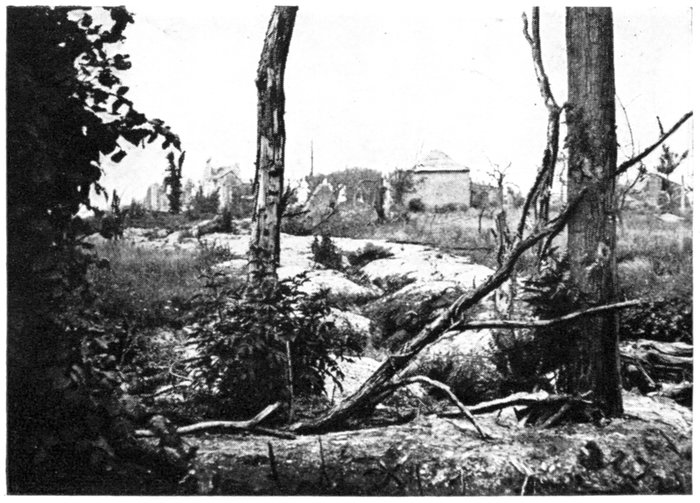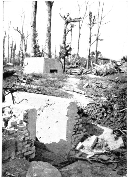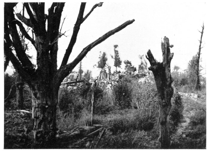 The outbuildings were still standing when the late war broke out; to-day they form a shapeless accumulation of débris. The park was entirely cut up with German entrenchments, of which only a few concrete machine-gun posts and underground shelters with concrete entrances remain. The fine old trees of the park were reduced by the shells to mutilated stumps.
