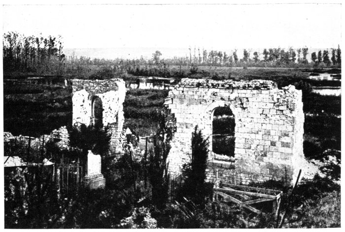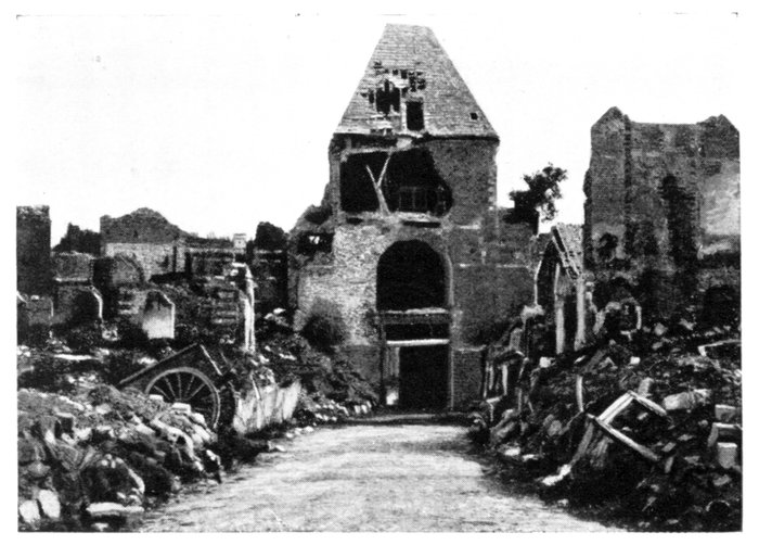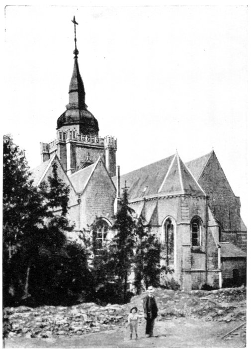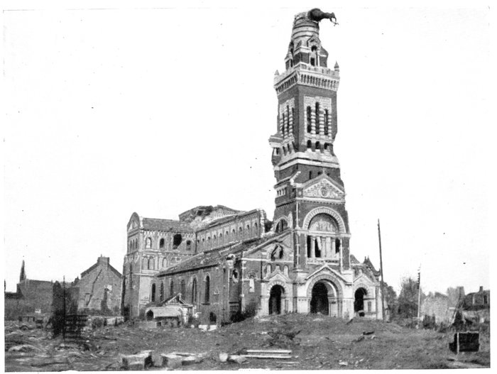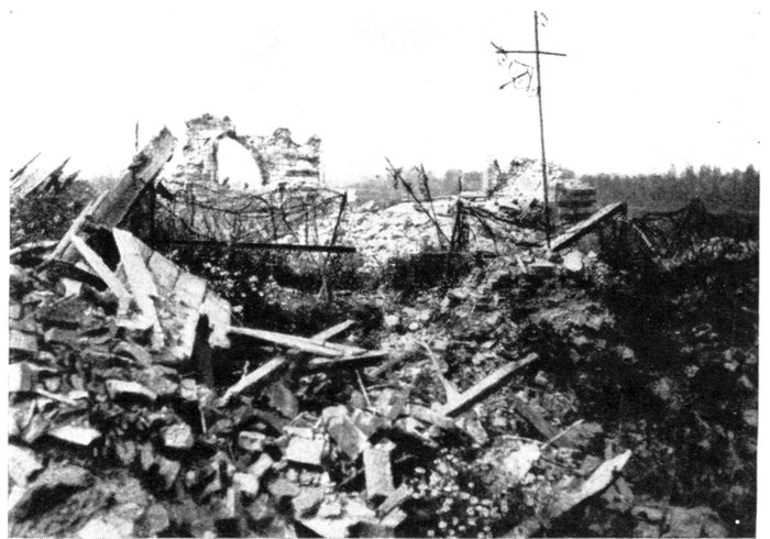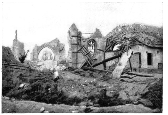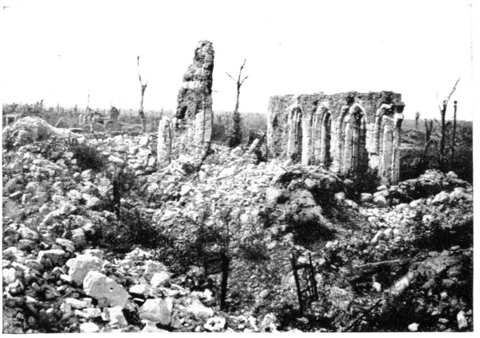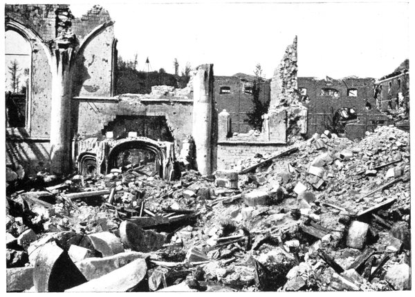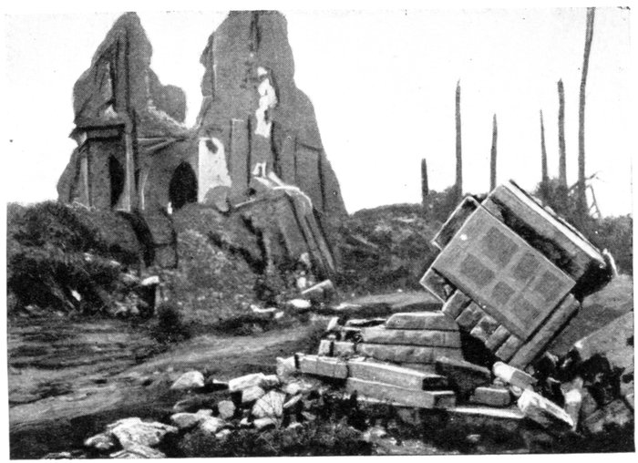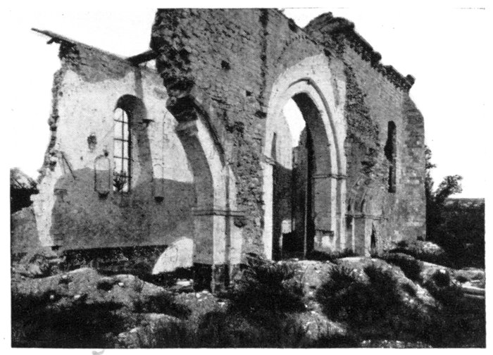 In July, 1916, the church had already lost its tower, roof and vaulting, but the outside walls, the pillars separating the three naves and the three gables of the main façade were still standing. Three months later nothing was left but fragments of broken walls, amidst a shapeless accumulation of débris (photos, p. 133).