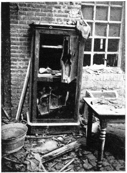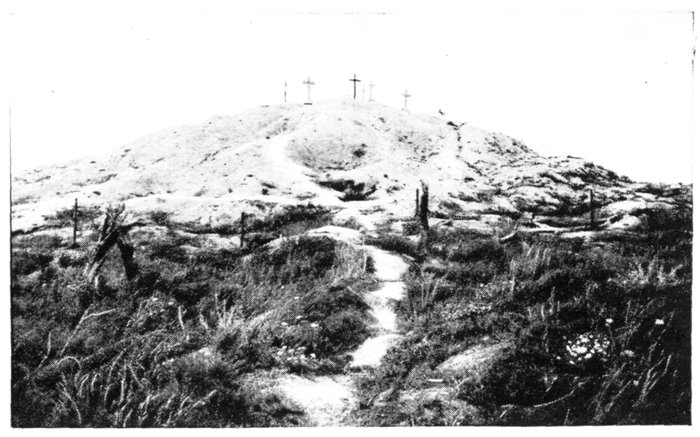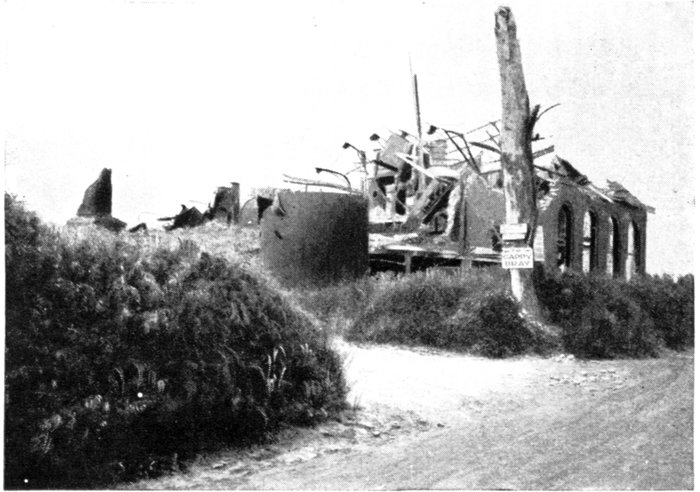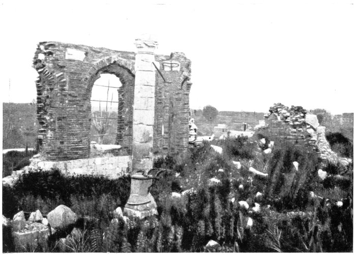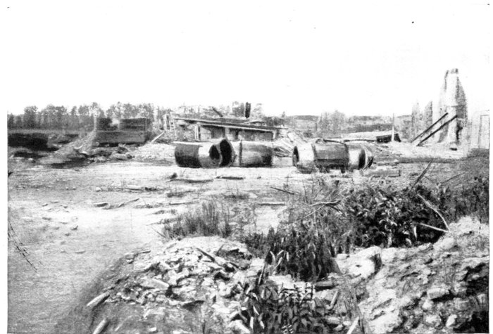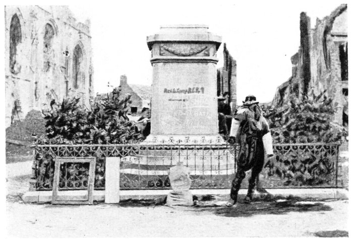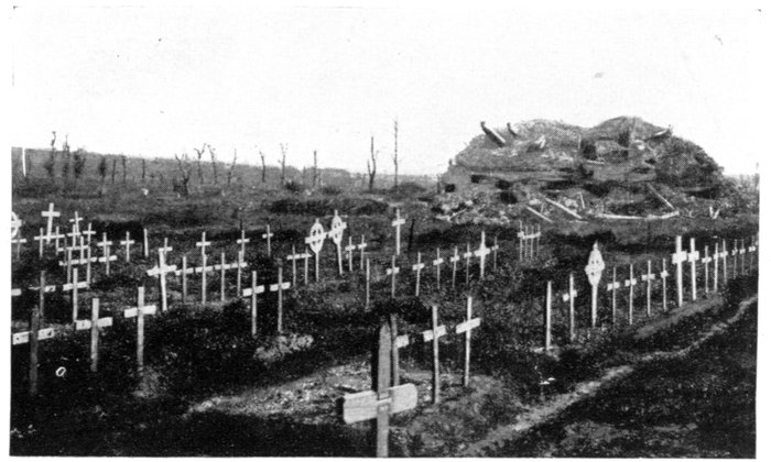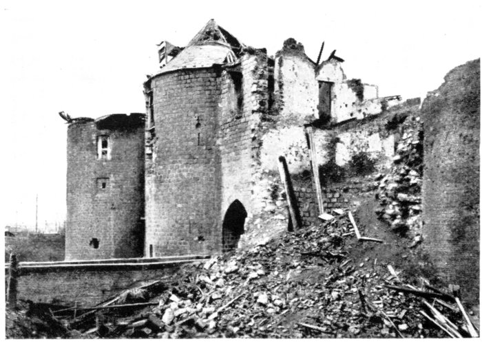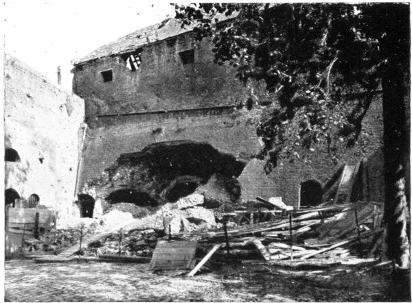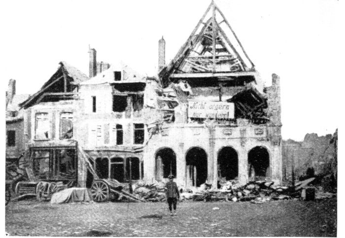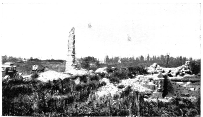 In July, 1916, the church had already lost its tower, roof and vaulting, but the outside walls, the pillars separating the three naves and the three gables of the main façade were still standing. Three months later nothing was left but fragments of broken walls, amidst a shapeless accumulation of débris (photos, p. 133).