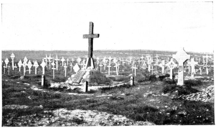 At the crossing of several roads, 3 km. beyond Lihons, take the newly-made road on the right to Herleville. The large French "Camp des Chasseurs" cemetery (photo below) is on the left, about 1 km. this side of the village of Herleville (completely devastated), which is next reached.