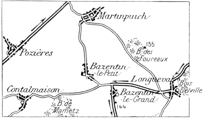 Skirt the southern end of Chaulnes Wood, near which, on either side of the road, are two powerful concrete blockhouses and other German defence-works.