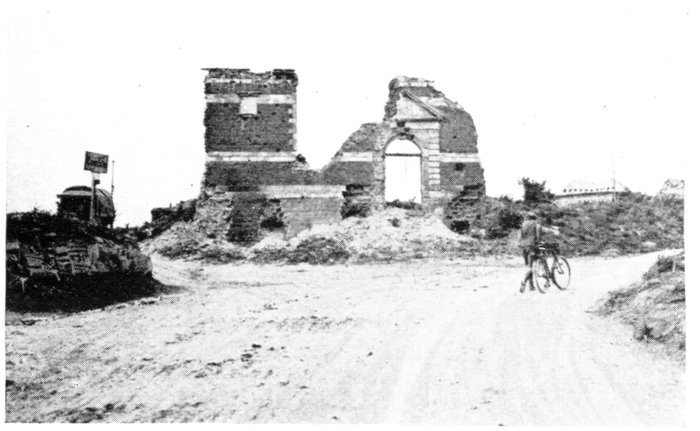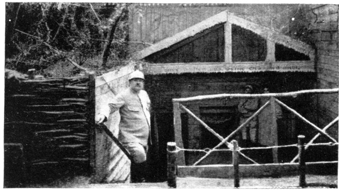 Near the entrance-gate of the château is a powerful system of defence-works, consisting of a machine-gun blockhouse and inter-communicating underground shelters, the entrances to which may be seen near the side of the road.