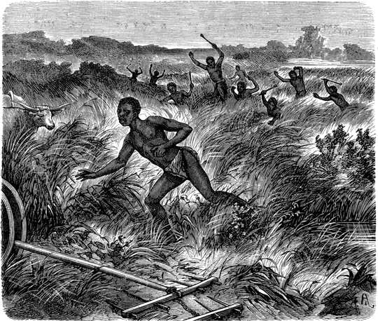 Leschumo-Thale. — Gereizte Elephanten auf der Flucht durch den