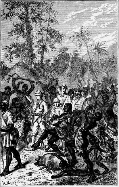 Als die Sterne hell vom Himmel strahlten, entwickelte sich draußen unter den Fenstern im Mondschein ein reges Durcheinander. Die Arbeiter der Gottfriedschen Faktoreien, unter Führung des Häuptlings, den der Buchhalter Johannes nannte, vollführten zum Vergnügen der Fremden einen ihrer Nationaltänze, wie sie trotz Arbeit und Gesittung bei den harmlosen Naturkindern immer noch sehr beliebt sind. Es mochten etwa sechs Anführer beisammen sein, jeder begleitet von zwei Narren, die dort als unerläßliches Gefolge des vornehmen Häuptlings gelten. Diese beiden jungen Männer trugen Anzüge von allen erdenklichen Farben, bald mit Federn, bald mit Stroh, Fasern und Zahnreihen geschmückt, in den Händen hielten sie Stöcke, die Gesichter waren unter schauderhaften, grob angestrichenen Masken versteckt, sie gebärdeten sich absichtlich wie Tollhäusler. Was irgend einer der Tänzer unternahm, das suchten sie zu vereiteln; was er ausführte, das ahmten sie in possenhafter Weise nach, am meisten die Musik, welche lediglich aus einem ohrenzerreißenden Trommeln bestand. Ein zwei Meter langer Block war ausgehöhlt, darauf wurde sonder Takt oder auch nur Übereinstimmung der Musiker mit derben Stöcken geschlagen, erst langsam, während sich die Tänzer langsam drehten, dann toller und immer toller, bis die ganze Menge raste, daß der Schweiß von allen Stirnen troff.