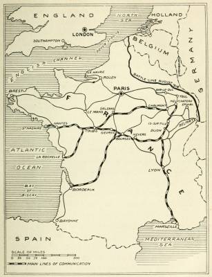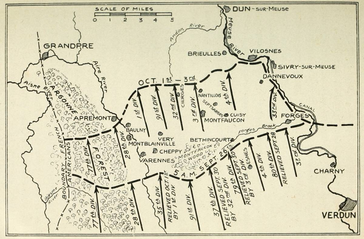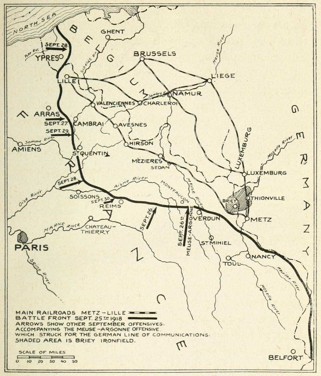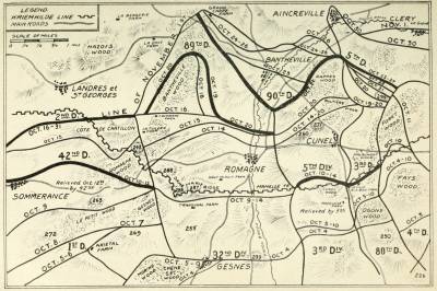 There are many disputes between divisions as the result of a proud and natural rivalry, which was possibly too energetically promoted by the staff in order to force each to its utmost before it staggered in its tracks from wounds and exhaustion. One division might have done the pioneer hammering and thrusting which gave a succeeding division its opportunity. A daring patrol of one division may have entered a position and been ordered to fall back; troops of another division may have taken the same position later. There was nothing so irritating as having to withdraw from hard-won ground because an adjoining unit could not keep up with the advance. Towns and villages were the landmarks on the map, with which communiqués and dispatches conjured; but often the success which made a village on low ground tenable was due to the taking of commanding hills in the neighborhood. Sometimes troops, in their eagerness to overcome the fire on their front, found[ix] themselves in the sector of an adjoining division, and mixed units swept over a position at the same time. In cases of controversy I have tried to adjust by investigation and by comparing reports. I must have made errors, whose correction I welcome. To illustrate the full detail of each division's advance would require several maps as large as a soldier's blanket. The maps which I have used are intended to indicate in a general way the movement of each division, and our part on the western front in relation to our Allies.
