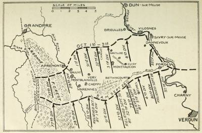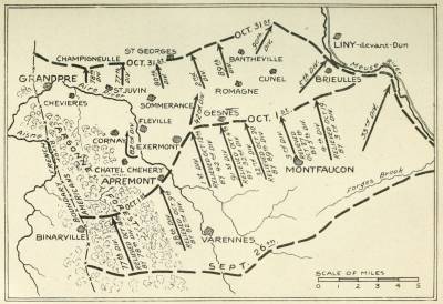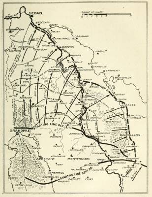 In the light of my observations during the battle,[vii] I went over the fields after the armistice, and studied the official reports, and talked with the men of our army divisions. For reasons that are now obvious, the results do not read like the communiqués and dispatches of the time, which gave our public their idea of an action which could not be adequately described until it was finished and the war was over. We had repulses, when heroism could not persist against annihilation by cross-fire; our men attacked again and again before positions were won; sometimes they fought harder to gain a little knoll or patch of woods than to gain a mile's depth on other occasions. Accomplishment must be judged by the character of the ground and of the resistance.