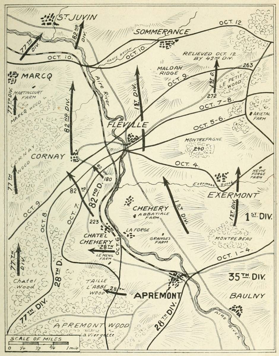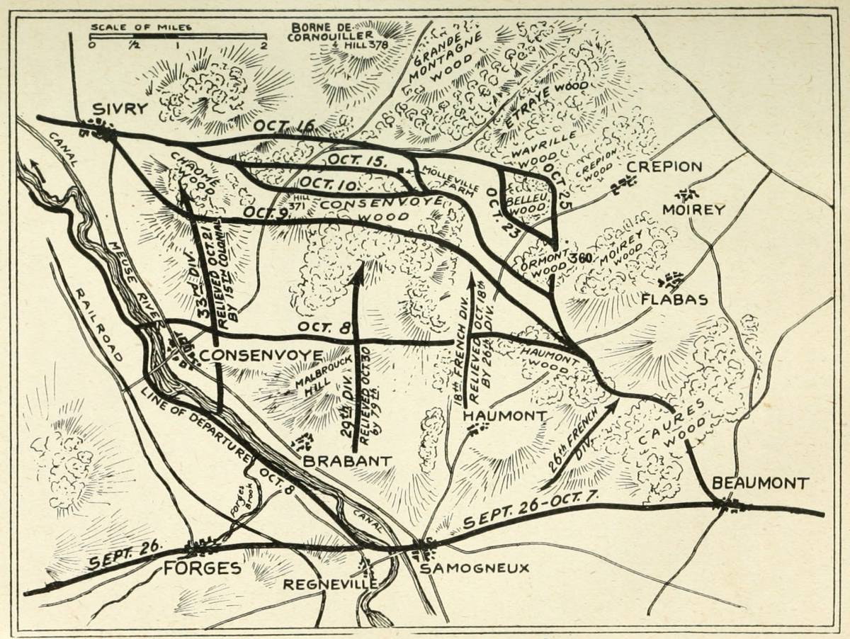 The soldier who knew only his division, his regiment, battalion, company, and platoon, as he lay in chill rain in fox-holes, without a blanket, under gas,[viii] shells, and machine-gun fire, or charged across the open or up slippery ascents for a few hundred yards more of gains, may learn, as accurately as my information warrants, in a freshened sense of comradeship, how and where other divisions fought. He may think that his division has not received a fair share of attention for its exploits. I agree with him that it has not, in my realization of the limitations of space and of capacity to be worthy of my subject.