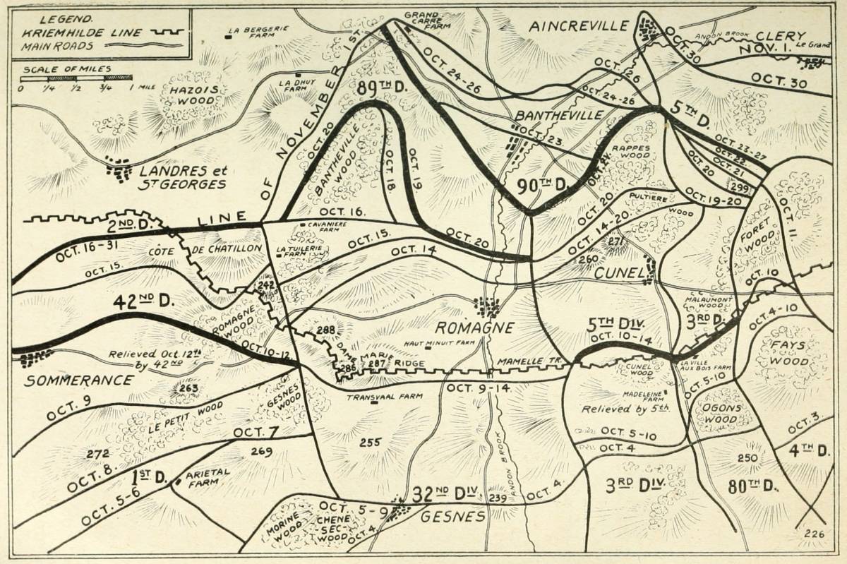 There may be surprise that I have not mentioned the names of individuals below the rank of division commander, and that I have not identified units lower than divisions. The easy and accepted method would have been to single out this and that man who had won the Medal of Honor or the Cross, and this or that battalion or company which had a theatric part. Indeed, the author could have made his own choices in distinction. I knew the battle too well; I had too deep a respect for my privilege to set myself up in judgment, or even to trust to the judgment of others. Not all the heroes won the Medal or the Cross. The winners had opportunities; their deeds were officially observed. How many men deserved them in annihilated charges in thickets and ravines, but did not receive them, we shall not know until our graves in France yield their secrets.