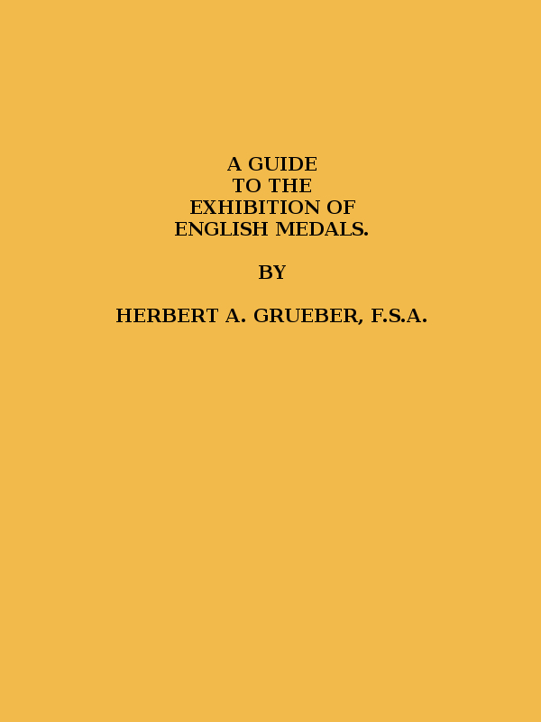 The medals described in this Guide have been selected for their historical interest from the larger series in the Medal Room, and are exhibited in the Cases marked E, F, G, H. The specimens in gold are represented by electrotypes, and those in lead by plaster casts, coloured so as to resemble the originals. Each medal is separately labelled and numbered, the numbers referring to the descriptions in the Guide.