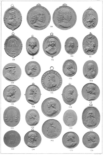 The selection of military and naval medals commences with that struck for the battle of Culloden, those which were issued before that period being included in the general series. The earliest pieces which belong to this class are probably the Armada medals; their variety, their oval form, as well as the circumstance that most have rings for suspension, and some have still chains attached to them, leaving little doubt but that they were intended as decorations. There is, however, no record that they were issued by authority. Charles I. is said to have granted in 1643 medals to soldiers who distinguished themselves in forlorn hopes; and the numerous badges issued during the Civil War by the King, and the Royalist and the Parliamentary generals were undoubtedly intended as military rewards and distributed among the soldiers who fought under them. No. 106, which was issued by Fairfax after the battle of Naseby, could only have served for such a purpose. During the Commonwealth the practice of bestowing decorative medals, both military and naval, became more frequent, and on several occasions was ordered by the Parliament. Of such medals is that xv distributed to all engaged at the battle of Dunbar (Nos. 149—150), and also those for Blake's victories over the Dutch, as well as several others.