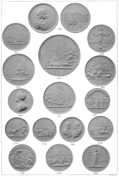 The War of the Spanish Succession, which had begun shortly before the death of William, was even more fruitful in medals than the previous conflict with France. For the events of the campaigns of the Duke of Marlborough and of Prince Eugene of Savoy in the Netherlands and Germany, and of that in Spain, as well as for the naval victories, the reader must be referred to the descriptions given at pp. 89—104. A few other events, which happened during the reign of Anne and to which medals refer, are the establishment of the Queen Anne's Bounty, the Union of England and Scotland in 1707, the attempted invasion of Scotland by the Elder Pretender in 1708, and the trial of Sacheverell.