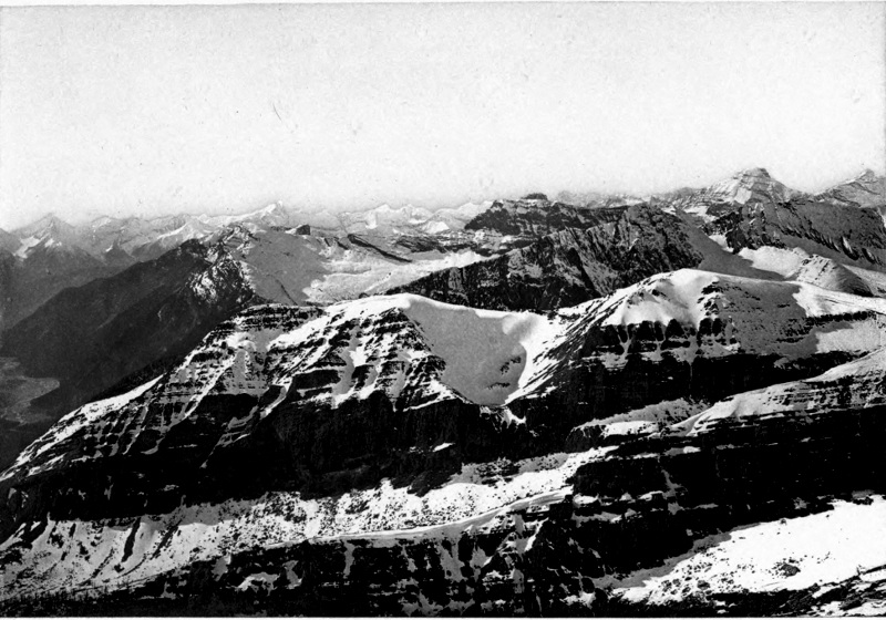 It would be difficult indeed to give even a partial description of the scene. Imagine a cool morning with the rising sun just beginning to touch the surface of a mountain lake. The air is tranquil and calm so that the glassy surface of the water mirrors the sky and mountains perfectly. 18 In the realm of sound, too, all is repose but for the call of birds near at hand among the balsam trees. From the shores of the lake on either side rise great mountains, showing cliffs and rocky ledges or long sweeping slopes of forest to the tree line. Higher still are bare slopes, crags, ledges, and scattered areas of snow. At the end of the lake a great notch in the nearer mountains reveals at a distance the wall-like, lofty mass of Mount Lefroy. This most imposing snowy mountain stands square across the gap, and with a sharp serrated cliff piercing the very vault of heaven, shuts off the view and forms the most conspicuous object of all. The lower part of the mountain is a vertical cliff or precipice where the longitudinal strata are distinctly visible. Above, rise alternating slopes covered with perpetual snow and hanging glaciers, the white-blue ice of which is splintered by deep rents and dark yawning crevasses. This mountain forms part of the continental water-shed, for on the other side the melting snows finally reach the Pacific Ocean, while on the near side the snows swept into the valleys by avalanches, and melted by the warmer air of lower altitudes, find their way at length into the Saskatchewan River and Hudson Bay.