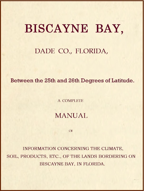 In our northern States there are thousands of health and pleasure seekers who every fall eagerly hasten away from comfortable and luxurious homes to escape the rigors of approaching winter. Of late years the current of travel has been constantly increasing, being directed more and more toward that portion of our country which, beyond dispute, can now claim to be more healthful and free from disease than any other section of the Union. The statistics furnished by the Surgeon-General of the United States establish this fact. He says: “The diseases which result from malaria are of a much milder type in the Peninsula of Florida than in any other State in the Union. These records show that the rates of deaths to the number of cases of remittent fever has been much less than among the troops serving in any other portions of the United States. In the middle division of the United States, the proportion is one death to thirty-six cases; in the northern, one to fifty-two; in the southern, one to fifty-four; in Texas, one to seventy-eight; in California, one to one hundred and twenty-two; in New Mexico, one to one hundred and forty-eight; while in Florida, it is but one to two hundred and eighty-seven.” More will be said upon this subject - 4 - further on. The facts compiled in this little pamphlet with great care, are not intended alone for the benefit of the invalid and mere seeker of pleasure. They are to attract the attention of the large number of people who for many years have been struggling in the various avenues of business, in our cities and large towns, men whose earnings, even if large in the aggregate, have been each year swallowed up by the increased cost of living in these later days. For those who would like a home in a more genial clime, where they can, by patient industry, within from two to six years, lay the sure foundation for a permanent income, where the expenses of living are not more than about one-fourth as great as in the north, these pages will surely be of interest and will repay them for the time consumed in their perusal. The peninsula of Florida extends abruptly from the main land of the continent, in a direction a little east of south. It is nearly 400 miles in length, and has an average width of 130 miles. Its formation is peculiar. Every other peninsula in the world owes its existence to a central mountain chain, which affords a stubborn resistance to the waves. Florida has no such elevations, and mainly a loose, low, sandy soil. It has another peculiarity. It is said, that at no other point in the world do the trade winds divide, as at Cape Sable. On the one hand, passing up the east coast to the Atlantic, and on the west into the Gulf of Mexico. This it is that produces that wonderful equability of climate, that puzzles a northern man to understand, why it should be so much cooler in summer than at the north. The base of all southern Florida is limestone, not tertiary, but modern and coralline. This it is that prevents all miasma, and this decomposed limestone with its admixture of vegetable mold, makes the best soil in the United States for the introduction of tropical plants. This it is, also, that causes the difference in fertility of this soil, as compared with the siliceous sand of the more northern part of the State. Biscayne Bay is located on the south-eastern coast of Florida, between the twenty-fifth and twenty-sixth degrees of north latitude, below the frost line, and is included within the limits of Dade county. The following facts are quoted from the “Florida Settler and Immigrants’ Guide,” prepared by Dennis Eagan, Commissioner of Lands and Immigration: “The climate of Dade county is exceedingly agreeable and conducive to health. The thermometer throughout the year shows a temperature of about seventy-five degrees, the extremes being fifty-one and ninety-two degrees. It is never visited by frost, and the heat in midsummer is much less oppressive than at New York or places further north, being tempered - 5 - by the influence of the Gulf Stream, which flows within a few miles of the coast. The water is pure and good. Many fine springs are found in different parts of the country; some of them mineral springs of considerable value. The everglades, which are within the limits of Dade county, simply consist of a shallow lake of vast extent—the water is from six inches to six feet in depth, and teems with aquatic and semiaquatic plants, which present to the eyes of the beholder a scene of perpetual verdure. Out of the surface of the lake rise innumerable small islands, which are covered over with a growth of cypress, sweet bay, crabwood, mastic, cocoa palms, cabbage palmetto, and live and water oaks. The waters abound in turtles, fish, etc. Around the margin of the everglades is a prairie, from half a mile to a mile in breadth; * * * this prairie comprises some of the richest land to be found in the United States, and has a productive capacity for every variety of vegetable life known in the tropics that is unsurpassed. * * * * Between the margin of the everglades and Biscayne Bay and Barnes Sound, there is a strip of land from three to fifteen miles in breadth. It is for the most part rocky pine land, and some portions have a considerable elevation above the level of the ocean. The deposits are oolitic and crystalline calcareous rock. In the vicinity of the bay the land is covered with an undergrowth of sago palm, called the coontie, probably from the Indian designation of the root. It yields an excellent article of starch, and also farina, which cannot be distinguished from Bermuda arrow root, except by the aid of the microscope. The soil is well adapted for the cultivation of sea island cotton, which is here perennial, and can be picked at almost all seasons of the year. Along the bay tobacco, equal to the best grown in Cuba, can be cultivated” (yielding from five to seven cuttings each year), “while every variety of tropical fruit ca