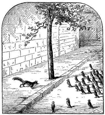 Very early one morning, as I was strolling along one of the quiet streets of Montreal, and feasting myself with the wonderful beauties of that most beautiful city, my attention was attracted by a great commotion going on among a flock of sparrows, which flew together from one place to another, sometimes alighting in the roadway of the street, and sometimes among the branches of the trees. At first I could see no cause for all this unusual fuss; but presently my eyes fell upon a little squirrel on the sidewalk, which seemed quite as much excited as the sparrows. If he ran along the street, the sparrows flew after him; if he stood still, the sparrows alighted, and faced him like a regiment of soldiers; if he scampered up the trunk of a tree, the sparrows collected in the branches above him, with a great chattering, until he ran down again, and then they followed him as before. The poor little fellow seemed fairly distracted, and I felt quite sorry for him. But then he was a thief. He had come down from the mountain at the back of the town to rob the sparrows' nests of their eggs, just like some Scottish Highland chief of old descending on the Lowlands to levy black-mail. What became of him I do not know, for after watching the encounter for ten or fifteen minutes I moved on. No doubt he was driven back to his mountain home a wiser and a better squirrel, having learned a lesson to content himself with vegetable diet, and not hanker after the luxuries of the city.