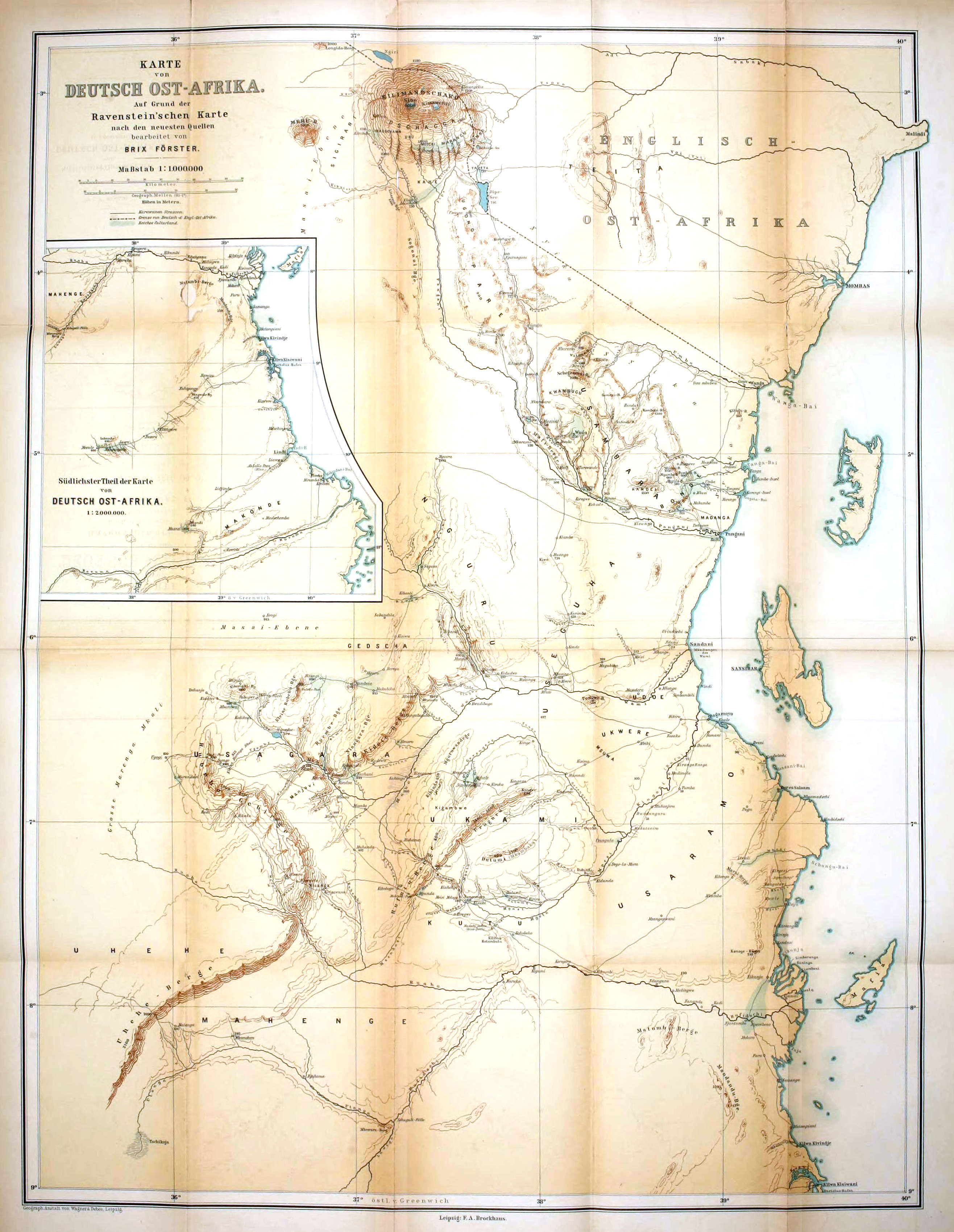In der kartographischen Darstellung von Ostafrika sind wir noch ziemlich weit entfernt von praktisch verwerthbarer Genauigkeit und Vollständigkeit trotz Ravenstein’s sorgfältiger, aber theilweise schon wieder veralteter Leistung. Zwar mögen die Flußläufe im großen und ganzen und die hervorragendsten Orte richtig fixirt sein; allein die Erhebungen des Geländes und die Gliederung der Gebirge dürften in vielen Fällen mehr der phantasievollen und prophetischen Gabe der Afrikareisenden Ehre machen, als den Thatsachen entsprechen. Das einzige verlässig und vollkommen durchgearbeitete Gebiet ist Usambara. Dies verdanken wir Dr. Baumann.