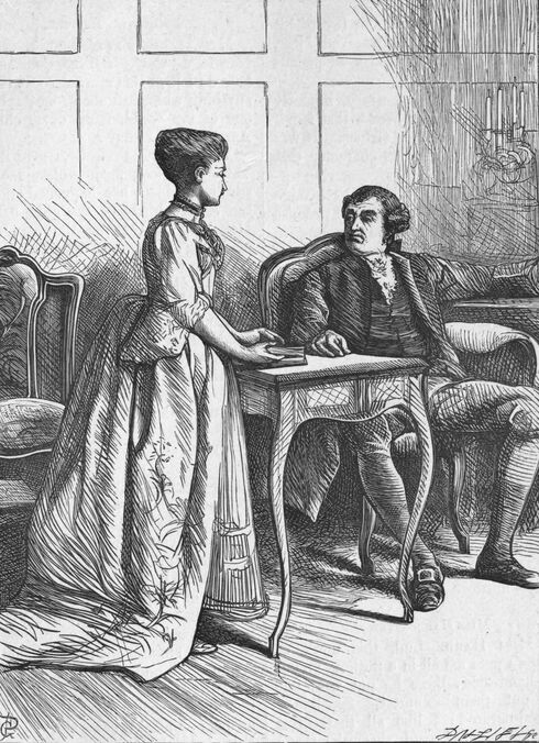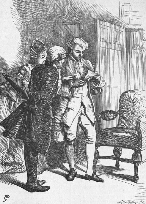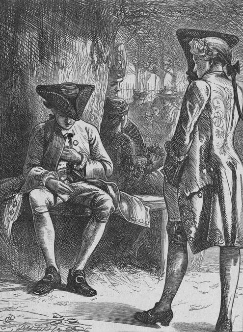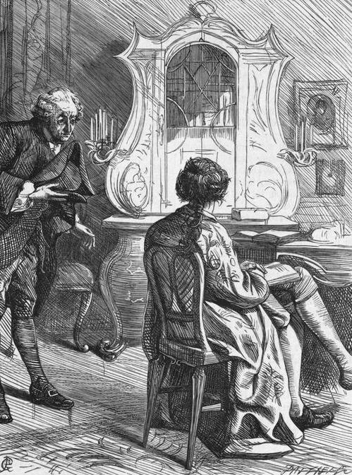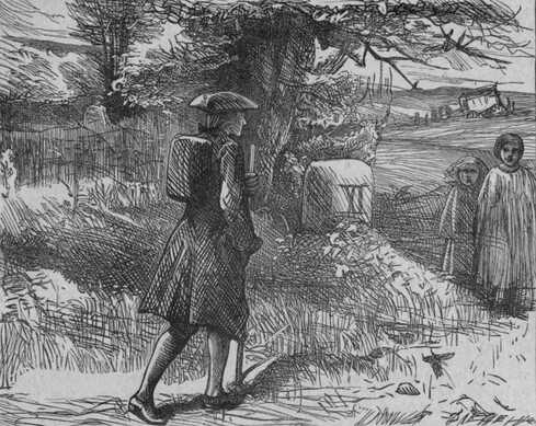 It was about the beginning of autumn, on a holiday—for I kept such as intervals of relaxation from labour—that I had drawn out my family to our usual place of amusement, and our young musicians began their usual concert. As we were thus engaged, we saw a stag bound nimbly by, within about twenty paces of where we were sitting, and, by its panting, it seemed pressed by the hunters. We had not much time to reflect upon the poor animal's distress, when we perceived the dogs and horsemen come sweeping along at some distance behind, and making the very path it had taken. I was instantly for returning in with my family; but either curiosity or surprise, or some more hidden motive, held my wife and daughters to their seats. The huntsman, who rode foremost, passed us with great swiftness, followed by four or five persons more, who seemed in equal haste. At last, a young gentleman, of a more genteel appearance than the rest, came forward, and for a while regarding us, instead of pursuing the chase stopped short, and, giving his horse to a servant who attended, approached us with a careless, superior air. He seemed to want no introduction, but was going to salute my daughters as one certain of a kind reception; but they had early learned the lesson of looking presumption out of countenance. Upon which he let us know that his name was Thornhill, and that he was the owner of the estate that lay for some extent around us. He again, therefore, offered to salute the female part of the family; and such was the power of fortune and fine clothes, that he found no second repulse. As his address, though confident, was easy, we soon became more familiar; and perceiving musical instruments lying near, he begged to be favoured with a song. As I did not approve of such disproportioned acquaintances, I winked upon my daughters in order to prevent their compliance; but my hint was counteracted by one from their mother, so that with a cheerful air they gave us a favourite song of Dryden's. Mr. Thornhill seemed highly delighted with their performance and choice, and then took up the guitar himself. He played but very indifferently; however, my eldest daughter repaid his former applause with interest, and assured him that his tones were louder than even those of her master. At this compliment he bowed, which she returned by a curtsey. He praised her taste, and she commended his understanding: an age could not have made them better acquainted: while the fond mother too, equally happy, insisted upon her landlord's stepping in, and taking a glass of her gooseberry. The whole family seemed earnest to please him: my girls attempted to entertain him with topics they thought most modern; while Moses, on the contrary, gave him a question or two from the ancients, for which he had the satisfaction of being laughed at; my little ones were no less busy, and fondly stuck close to the stranger. All my endeavours could scarcely keep their dirty fingers from handling and tarnishing the lace on his clothes, and lifting up the flaps of his pocket-holes, to see what was there. At the approach of evening he took leave; but not till he had requested permission to renew his visit, which, as he was our landlord, we most readily agreed to.