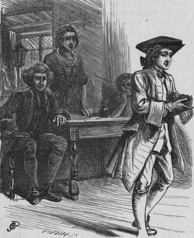 His departure only prepared the way for our own, which arrived a few days afterwards. The leaving a neighbourhood in which we had enjoyed so many hours of tranquillity was not without a tear, which scarcely fortitude itself could suppress. Besides, a journey of seventy miles, to a family that had hitherto never been above ten from home, filled us with apprehension; and the cries of the poor, who followed us for some miles, contributed to increase it. The first day's journey brought us in safety within thirty miles of our future retreat, and we put up for the night at an obscure inn in a village by the way. When we were shown a room, I desired the landlord, in my usual way, to let us have his company, with which he complied, as what he drank would increase the bill next morning. He knew, however, the whole neighbourhood to which I was removing, particularly Squire Thornhill, who was to be my landlord, and who lived within a few miles of the place. This gentleman he described as one who desired to know little more of the world than its pleasures, being particularly remarkable for his attachment to the fair sex. He observed, that no virtue was able to resist his arts and assiduity, and that there was scarcely a farmer's daughter within ten miles round but what had found him successful and faithless. Though this account gave me some pain, it had a very different effect upon my daughters, whose features seemed to brighten with the expectation of an approaching triumph; nor was my wife less pleased and confident of their allurements and virtue. While our thoughts were thus employed, the hostess entered the room to inform her husband that the strange gentleman, who had been two days in the house, wanted money, and could not satisfy them for his reckoning. "Want money!" replied the host, "that must be impossible; for it was no later than yesterday he paid three guineas to our beadle to spare an old broken soldier that was to be whipped through the town for dog-stealing." The hostess, however, still persisting in her first assertion, he was preparing to leave the room, swearing that he would be satisfied one way or another, when I begged the landlord would introduce me to a stranger of so much charity as he described. With this he complied, showing in a gentleman who seemed to be about thirty, dressed in clothes that once were laced. His person was well-formed, and his face marked with the lines of thinking. He had something short and dry in his address, and seemed not to understand ceremony, or to despise it. Upon the landlord's leaving the room, I could not avoid expressing my concern to the stranger at seeing a gentleman in such circumstances, and offered him my purse to satisfy the present demand. "I take it with all my heart, sir," replied he, "and am glad that a late oversight, in giving what money I had about me, has shown me that there are still some men like you. I must, however, previously entreat being informed of the name and residence of my benefactor, in order to repay him as soon as possible." In this I satisfied him fully, not only mentioning my name and late misfortune, but the place to which I was going to remove. "This," cried he, "happens still more luckily than I hoped for, as I am going the same way myself, having been detained here two days by the floods, which I hope, by to-morrow, will be found passable." I testified the pleasure I should have in his company, and my wife and daughters joining in entreaty, he was prevailed upon to stay supper. The stranger's conversation, which was at once pleasing and instructive, induced me to wish for a continuance of it; but it was now high time to retire and take refreshment against the fatigues of the following day.