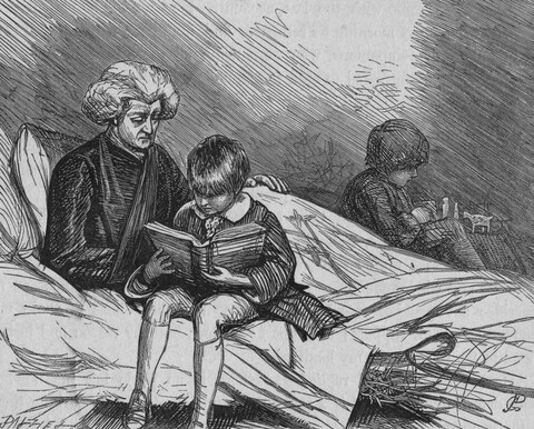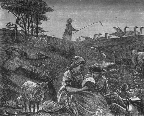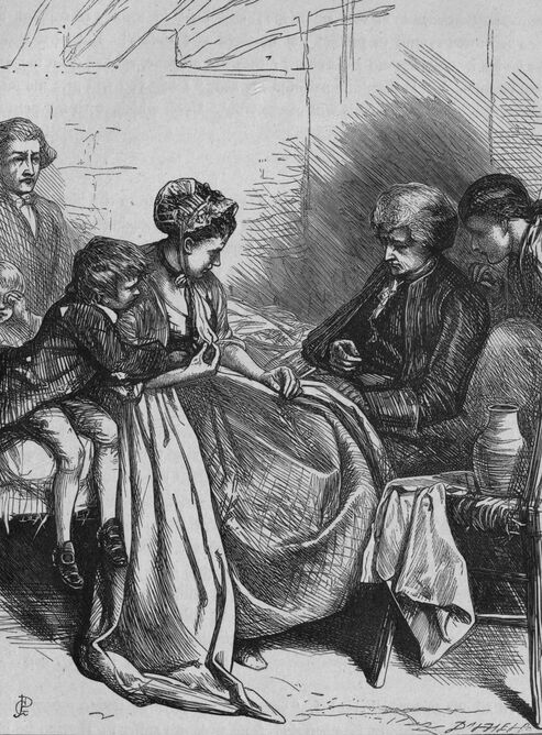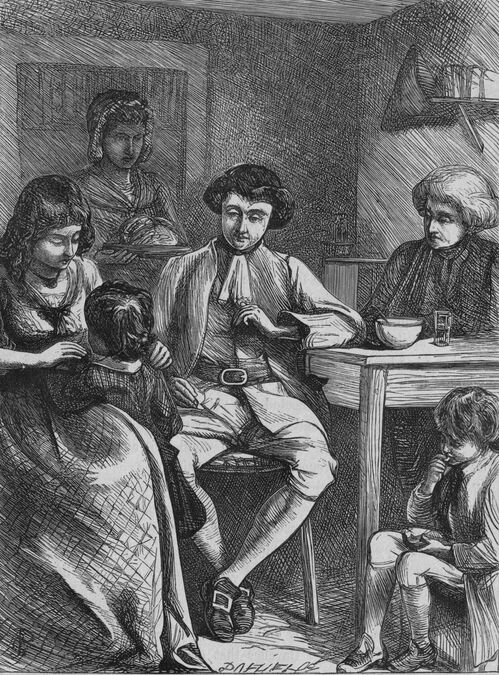 As we rose with the sun, so we never pursued our labours after it was gone down, but returned home to the expecting family; where smiling looks, a neat hearth, and pleasant fire were prepared for our reception. Nor were we without guests; sometimes Farmer Flamborough, our talkative neighbour, and often the blind piper, would pay us a visit, and taste our gooseberry-wine, for the making of which we had lost neither the recipe nor the reputation. These harmless people had several ways of being good company; for while one played, the other would sing some soothing ballad—Johnny Armstrong's Last Good-night, or the Cruelty of Barbara Allen. The night was concluded in the manner we began the morning, my youngest boys being appointed to read the lessons of the day; and he that read loudest, distinctest, and best, was to have a halfpenny on Sunday to put into the poor's-box.