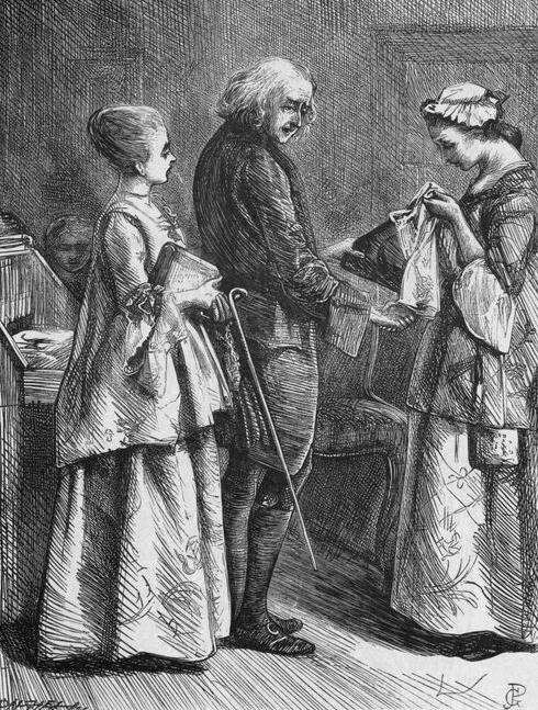 The temper of a woman is generally formed from the turn of her features; at least it was so with my daughters. Olivia wished for many lovers; Sophia to secure one. Olivia was often affected, from too great a desire to please; Sophia even repressed excellence, from her fear to offend. The one entertained me with her vivacity when I was gay, the other with her sense when I was serious. But these qualities were never carried to excess in either, and I have often seen them exchange characters for a whole day together. A suit of mourning has transformed my coquette into a prude, and a new set of ribands has given her younger sister more than natural vivacity. My eldest son, George, was bred at Oxford, as I intended him for one of the learned professions. My second boy, Moses, whom I designed for business, received a sort of miscellaneous education at home. But it is needless to attempt describing the particular characters of young people that had seen but very little of the world. In short, a family likeness prevailed through all; and, properly speaking, they had but one character—that of being all equally generous, credulous, simple, and inoffensive.