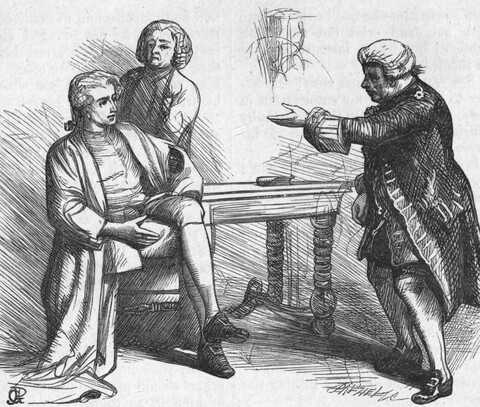 But the wish to relieve was so largely in excess of the power, that frequently when Justice called to present a claim for payment Generosity had been beforehand, and had carried away the money; and Justice had to wait, or, alas, in too many cases, to go away unsatisfied. Thus the most humiliating position in which Goldsmith was ever placed in the days of his direst poverty, arose from his hastily obeying an impulse to relieve the landlord of his miserable lodgings, who had been arrested for debt, and whose wife came to Goldsmith, weeping and wringing her hands. Thinking only how he could liberate the poor man by the only means in his power, the poet rushed off and pledged some books, and a suit of clothes, procured on the credit of Ralph Griffiths, a bookseller, that Goldsmith might appear decently at an examination, which he failed to pass, and dire was the wrath of Griffiths on the occasion.