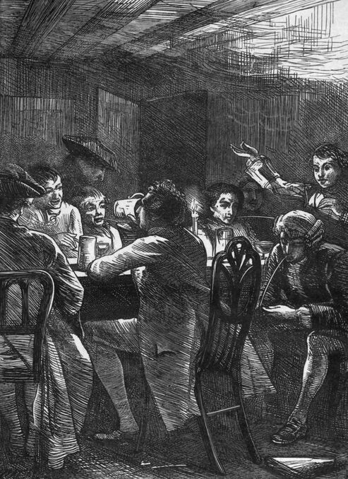 "Every day now began to strip Jack of his former finery: his clothes flew piece by piece to the pawnbrokers'; and he seemed at length equipped in the genuine mourning of antiquity. But still he thought himself secure from starving; the numberless invitations he had received to dine, even after his losses, were yet unanswered; he was, therefore, now resolved to accept of a dinner, because he wanted one; and in this manner he actually lived among his friends a whole week without being openly affronted."