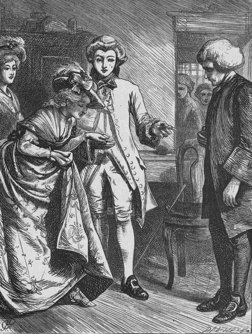"Not quite disconcerted by this refusal, our adventurer was resolved to apply to another, whom he knew to be the very best friend he had in the world. The gentleman whom he now addressed received his proposal with all the affability that could be expected from generous friendship. 'Let me see,—you want a hundred guineas; and, pray, dear Jack, would not fifty answer?'—'If you have but fifty to spare, sir, I must be contented.'—'Fifty to spare! I do not say that, for I believe I have but twenty about me.'—'Then I must borrow the other thirty from some other friend.'—'And pray,' replied the friend, 'would it not be the best way to borrow the whole money from that other friend, and then one note will serve for all, you know? Lord, Mr. Spindle, make no ceremony with me at any time; you know I'm your friend, when you choose a bit of dinner, or so. You, Tom, see the gentleman down. You won't forget to dine with us now and then? Your very humble servant.'