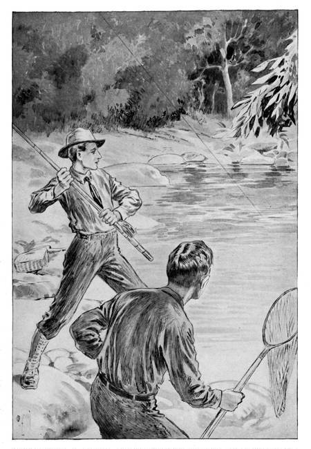 In a few moments, the road taking a bend through the trees, they set the woods ringing with shouts of satisfaction, for before them they caught a glimpse of the placid blue waters of Phantom Lake. Soon the broad sweep of the sheltered island-dotted lake, with a range of mountainous hills rising directly from the shore at the further side, opened out before them, the prospect being one to make their youthful hearts beat swiftly.