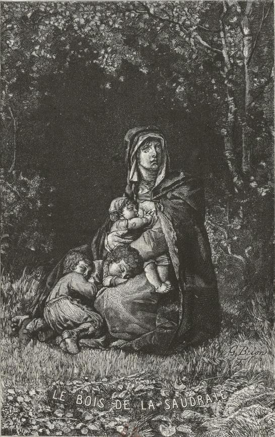 In the thickest part of the copse on the edge of one of those small circular clearings made in the woods by the charcoal-furnaces that are used to burn the roots of trees, in a sort of hole formed by the branches,—a bower of foliage, so to speak, half-open, like an alcove,—sat a woman on the moss, with a nursing child at her breast and the fair heads of two sleeping children resting against her knees.